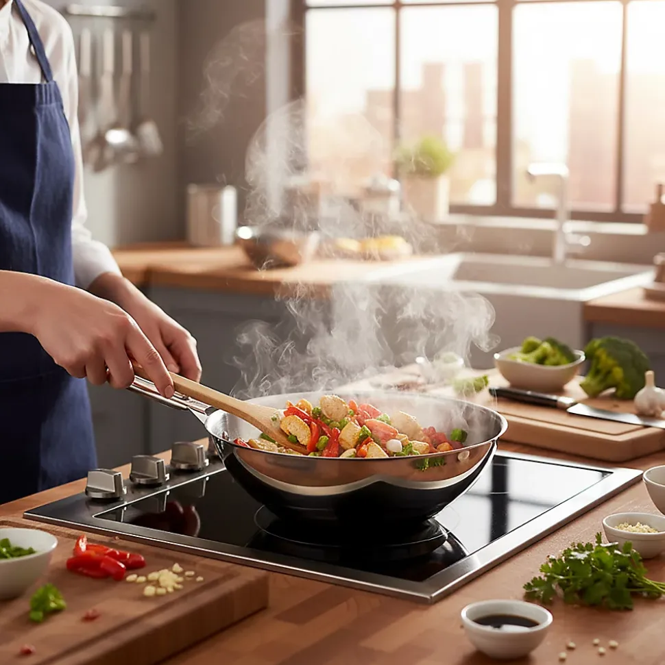 - Wok en inox de diamètre 28cm. Inox finition miroir et fond encapsulé de 6mm d’épaisseur pour une parfaite répartition de la chaleur, sur tous types de feux. Qualité professionnelle et ligne élégante.