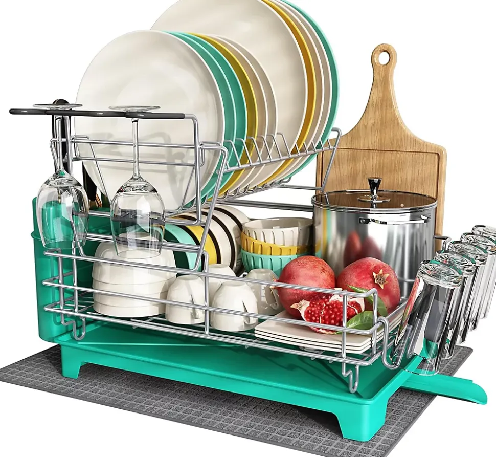 Egoutoire Vaisselle Auto-égouttant – L’égouttoir pratique recueille l’eau et l’évacue automatiquement. L’égouttoir intégré a une grande capacité et le bec de vidange est orientable à 270°, ce qui vous permet de placer l’égouttoir dans la meilleure position possible à côté de l’évier pour répondre à vos besoins. Le tapis de séchage supplémentaire facilite le travail et permet un séchage immédiat de la vaisselle.Séchoir à Vaisselle à Deux Niveaux – Ce grand égouttoir à vaisselle est un excellent complément à votre cuisine, 16(L)*13(L)*11(H) pouces, livré avec un égouttoir à vaisselle, un tapis en microfibre, un porte-ustensiles, 7 porte-gobelets et un porte-planche à découper. Ce porte-vaisselle multicolore n’est pas seulement un must pour les nouvelles maisons et les nouveaux appartements, c’est aussi le cadeau idéal pour les amis et la famille.Porte-Vaisselle Robuste et Durable – L’égouttoir à vaisselle est fabriqué en acier inoxydable avec un revêtement noir. Il est robuste et ne rouille pas. Tous les bords et coins sont arrondis et polis pour éviter les rayures et les dommages à la vaisselle. Tous les supports sont équipés de caoutchouc antidérapant pour éviter que la vaisselle ne glisse. Les casiers à vaisselle sont correctement espacés afin que les assiettes posées ne tombent pas vers l’avant ou vers l’arrière.Panier à Vaisselle Amovible – Nos séchoirs à vaisselle doubles amovibles et leurs accessoires prennent moins de place sur le plan de travail, tout en pouvant contenir plus de vaisselle que les séchoirs à vaisselle ordinaires. Il est très spacieux et peut contenir une grande variété d’articles de cuisine. Vous pouvez placer le deuxième égouttoir à vaisselle amovible sur le plan de travail ou dans l’évier pour un accès facile ou pour l’adapter à la hauteur de vos armoires.
