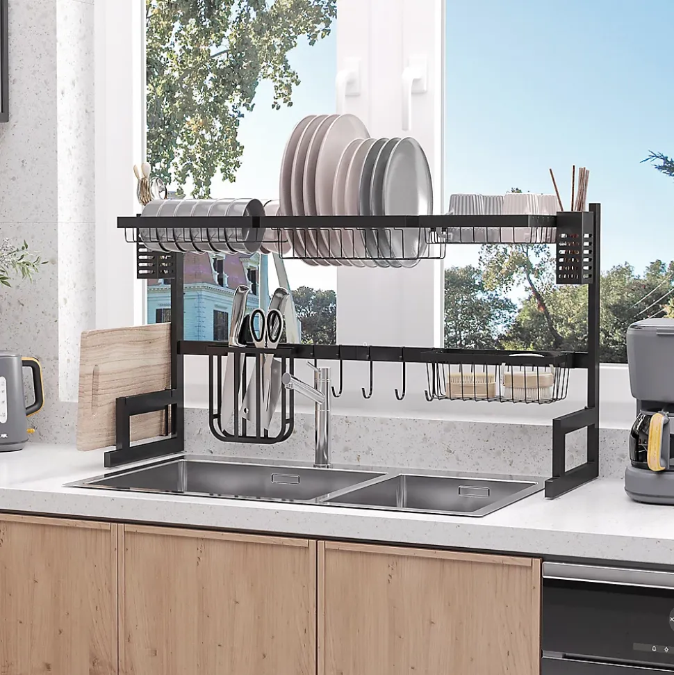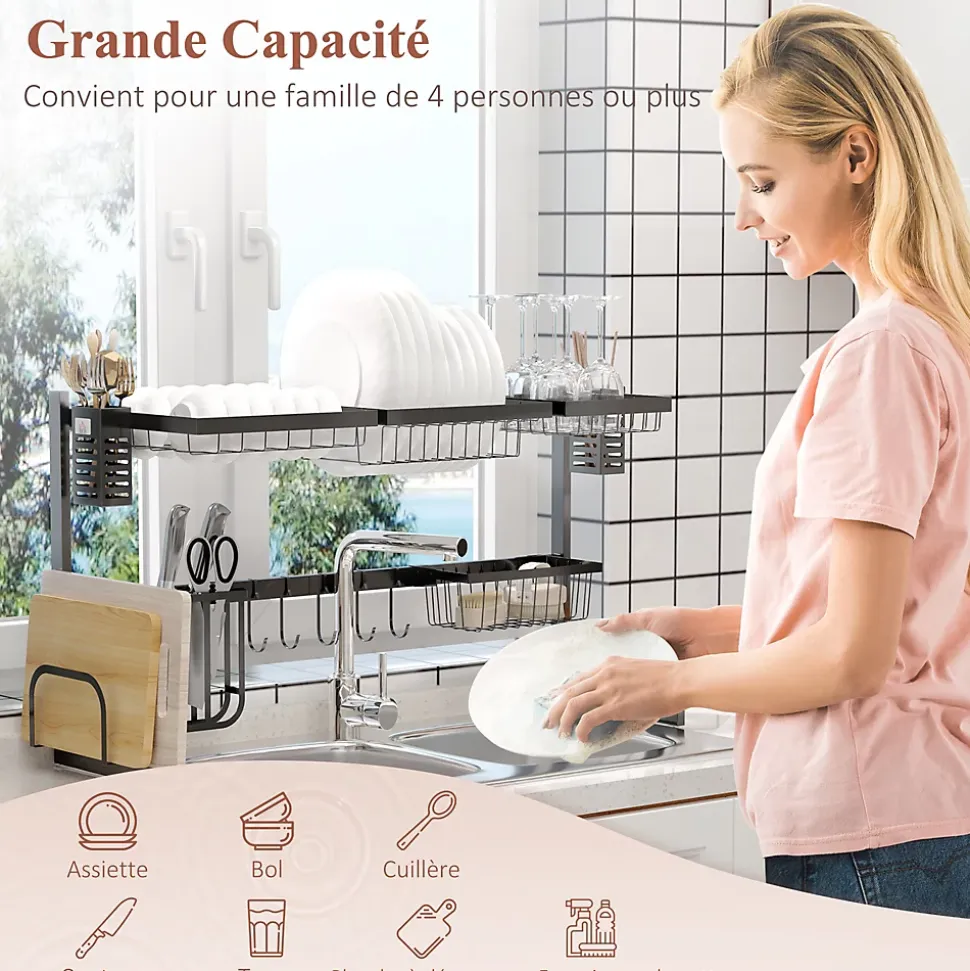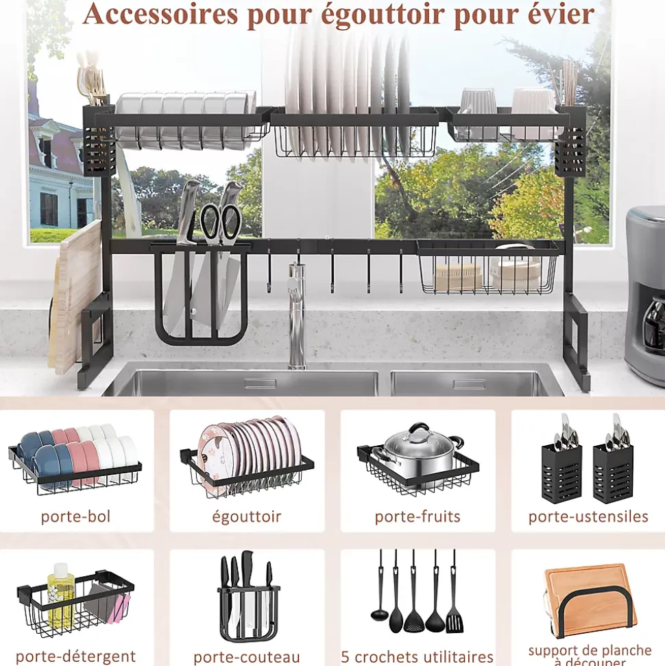 Cet égouttoir organisateur va vite devenir un essentiel de votre cuisine. On aime le design sobre et minimaliste de cet égouttoir organisateur de cuisine en métal noir. Il apportera de l’élégance dans toutes les cuisines. Grâce à ses 2 niveaux et ses nombreux rangements modulaires, il s’adaptera parfaitement à vos besoins. Il est spacieux et robuste et vous pouvez y déposer vos ustensiles quotidiens : plats, bols, couteaux, planche à découper, etc. plutôt que de les éparpiller sur votre plan de travail. Un organisateur indispensable pour votre cuisine !Caractéristiques :- Grande capacité, convient pour les familles de 4 personnes ou plus- Comprend un porte-bol, un porte-assiette, un panier à fruits, deux porte-ustensiles, un porte-détergent, un porte-couteau, cinq crochets et un porte-planche à découper pour garder vos ustensiles organisés- Espaces agrandis accélèrant le séchage en offrant un flux d’air optimal et ainsi empêchant la prolifération des bactéries- Fabriqué en acier inoxydable et résistant aux rayures pour supporter jusqu’à 23 Kg- Pieds revêtus de ventouses antidérapantes évitant à l’article de glisser de votre plan de travail- Montage facile à l’aide du manuel d’assemblage illustré fourniSpécifications :- Couleur : noir- Matériau principal : acier inox.- Dim. totales : 93L x 30l x 52,5H cm- Charge max. recommandée : 23 Kg (au total), 3 Kg (panier), 2 Kg (porte-ustensiles), 3 Kg (porte-couteaux), 5 Kg (porte-planche à découper), 0,2 Kg (par crochet)- Livraison effectuée en un colis- Réf. : 801-287V00BK