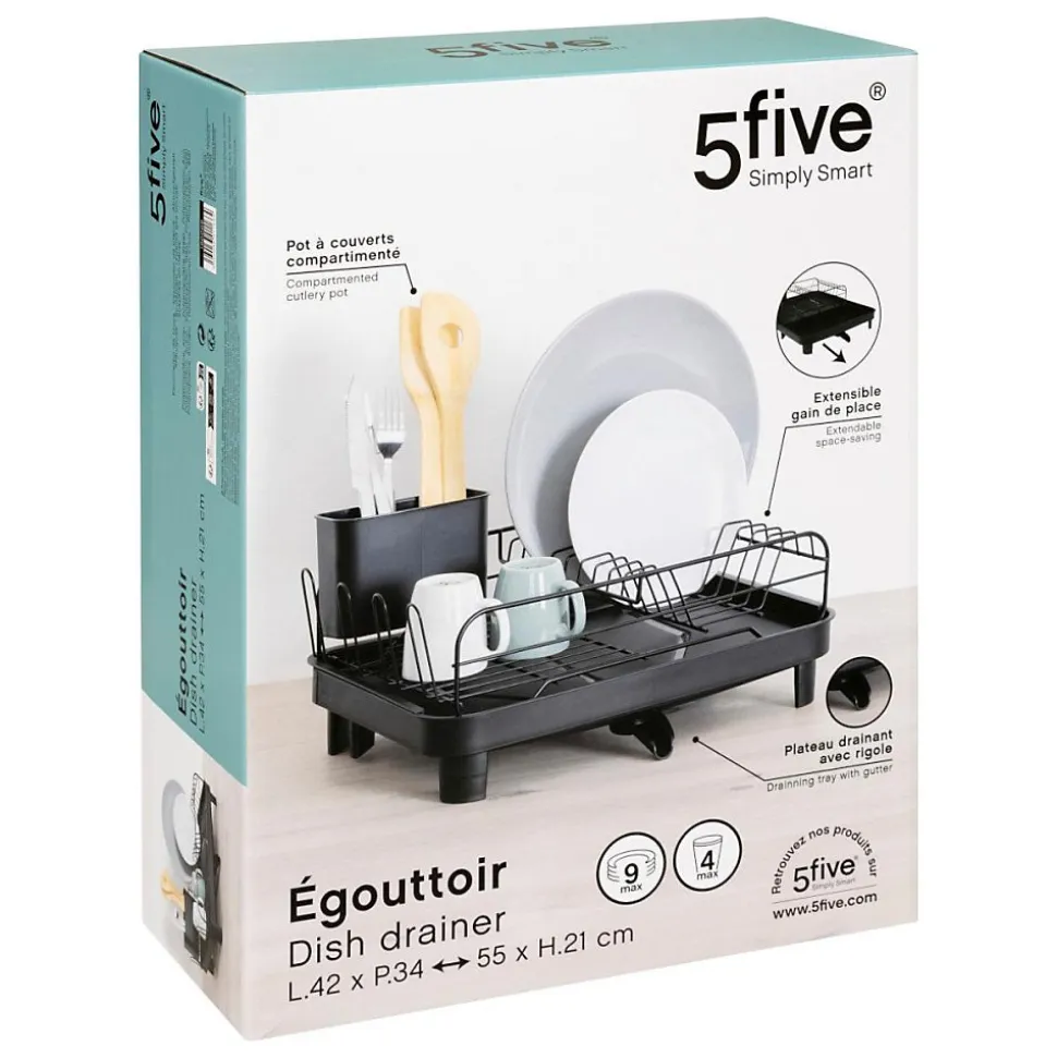 Même un égouttoir peut être design et apporter un plus à la décoration de votre cuisine, c’est le cas de l’égouttoir à vaisselle extensible noir.Il vous permettra de sécher assiettes et couverts en s’adaptant à votre besoin de place.Informations sur l’égouttoir à vaisselle extensible noir:Dimensions : L. 42 cm x Profondeur de 34 à 55cm selon vos besoins x H. 21 cmPlateau drainant avec rigole d’évacuation de l’eauExtensible pour un gain de placeRange couverts compartimentéCapacité assiettes : 9Capacité verres : 4Matières : Polypropylène et acierPoids : 1.414 Kg