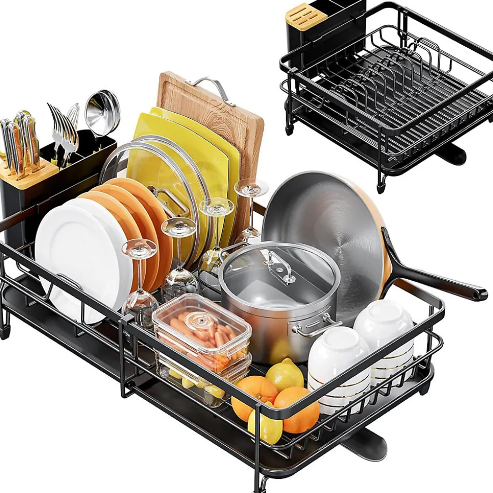 Métal de qualité supérieure : égouttoir robuste, résistant à la rouille et aux rayures en métal très résistant pour une utilisation durable sans déformation.Design flexible : extensible et pliable, s’adapte facilement à différents plans de travail de cuisine. Longueur réglable : 32-54 cm, largeur : 31 cm, hauteur : 14 cm.Porte-couverts pratique : avec évacuation pour l’eau, espace pour plus de 60 fourchettes, couteaux et cuillères, ainsi que bloc à couteaux en bambou amovible pour un rangement sûr.Système de drainage efficace : bec de vidange rapide pivotant à 360° avec trois positions pour permettre à l’eau de s’écouler dans l’évier et garder le plan de travail sec.Stabilité et protection : 5 pieds en caoutchouc antidérapants maintiennent l’égouttoir stable et protègent le plan de travail et l’évier des rayures.