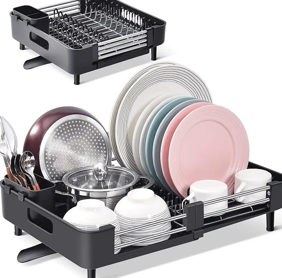 [Design extensible]: grâce au design élégant et extensible, vous pouvez l’étendre pour contenir plus d’articles ou le plier pour économiser de l’espace. Dimensions : 34-55 x 31,5 x 11 cm. Il est parfait pour différents espaces de comptoir de cuisine.[Anti-rayures et antidérapant]:les broches du support à assiettes sont recouvertes d’un couvercle de protection, il empêche vos articles de rayures, de tomber et réduit l’apparence du bruit. Les pieds en caoutchouc antidérapants maintiennent la stabilité de l’ensemble du support et ne rayeront pas le plan de travail. [Évacuation intégrée et facile à nettoyer]: les nervures surélevées dans le fond empêchent l’eau d’être piégée et la canalisent vers le bouchon intégré. Le bec de drainage pivotant peut directement drainer l’eau dans l’évier. L’égouttoir à assiettes et le porte-couverts sont démontables, ce qui rend l’égouttoir à vaisselle facile à nettoyer. [Multifonction et grande capacité]: les broches du support à assiettes le rendent non seulement adapté pour ranger des assiettes, mais également pour les bols, verres à vin et tasses, etc. L’ensemble de l’égouttoir à vaisselle peut contenir jusqu’à plus de 10 assiettes, 4 verres à vin, 6 tasses, 30 articles de table et 6 bols.: