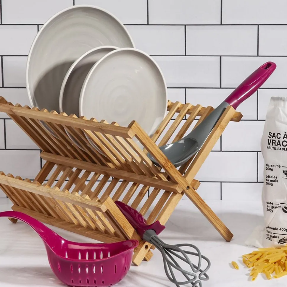Cet égouttoir à vaisselle pliable est entièrement fabriqué en bambou. Il vous aidera à sécher votre vaisselle tout en contribuant au développement durable!Informations sur l’égouttoir à vaisselle :PliantDimensions : L. 33 x P. 40.3 x H. 24 cmMatières : BambouPoids : 712 gr