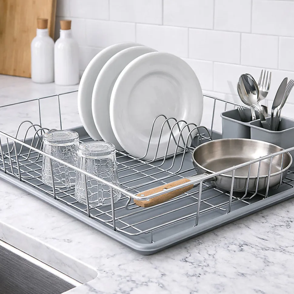 Egouttoir à vaisselles de la marque MSV. L’INDISPENSABLE DANS VOTRE CUISINE: Facile à installer, l’egouttoir à vaisselle trouvera sa place dans votre pièce en un clein d’il. QUALITÉ MSV: En acier robuste et résistant à la rouille pour une durabilité garanti. FONCTIONNEL: Le séchage de votre vaisselle sera plus rapide grâce aux divers emplacements prévus à cet effet. Dimensions: 48x30x10cm Couleur: Gris Matière: Acier