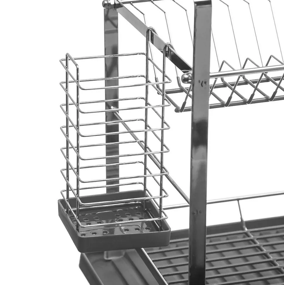 Dimensions : L. 46.2 x P. 33 x H. 35 cmPoids : 1,97 kgMatière de la structure : Acier chroméMatière du plateau : PE – PolyéthylèneCapacité : 17 assiettes / 8 verresInclus : Pot à ustensiles. Tapis vaisselle .Trou d’évacuation