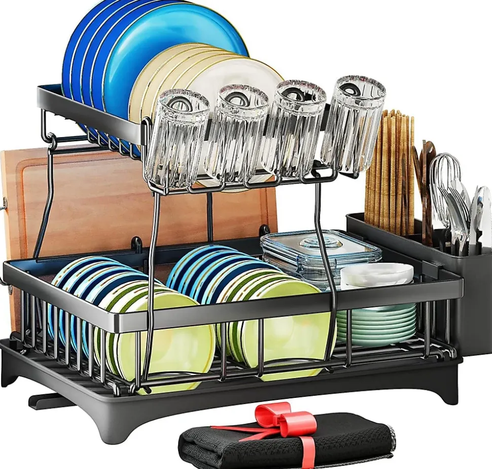 【Design Détachable à 2 Niveaux 】 Cet égouttoir à vaisselle dispose d’un design amovible à 2 niveaux, offrant un très grand espace pour ranger la vaisselle de différentes tailles telles que les assiettes, les assiettes, les tasses, les poêles, les casseroles et les bols. Avec un porte-ustensiles, un porte-gobelet, cet égouttoir à vaisselle répondra à tous vos besoins de stockage et d’égouttage des ustensiles de cuisine.【Construction Robuste】Notre égouttoir à vaisselle pour comptoir de cuisine est fabriqué en acier au carbone de qualité supérieure avec finition en poudre noire. La construction robuste fournira une forte capacité de charge pour ranger tous vos ustensiles de cuisine facilement.【Système De Drainage Rapide】L’égouttoir à vaisselle dispose d’un égouttoir amovible qui comprend des trous de drainage centraux et un bec pivotant, assurant que l’eau coule directement dans l’évier, pas sur le plan de travail. Le bec pivotant est rotatif à 360 °, vous permettant de régler la position de l’égouttoir plus librement selon l’emplacement de l’évier.【Égouttoir Multifonction Et Design Attentionné】 Notre égouttoir à vaisselle est non seulement conçu avec le support d’assiette, mais également livré avec un porte-gobelet et un porte-ustensiles pour répondre à vos besoins de stockage des ustensiles de cuisine avec un accrochage sans effort. De plus, la clôture surélevée autour de la base du support empêche efficacement la vaisselle de tomber et de se casser.