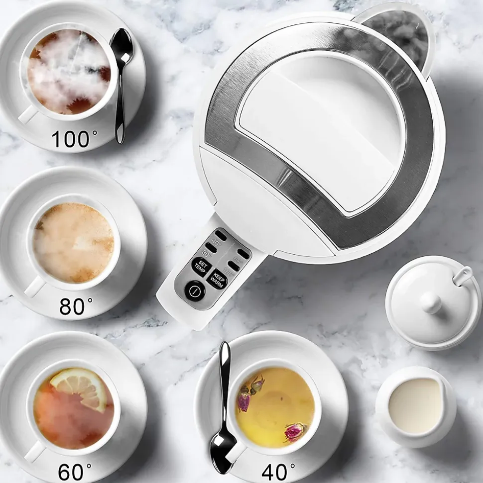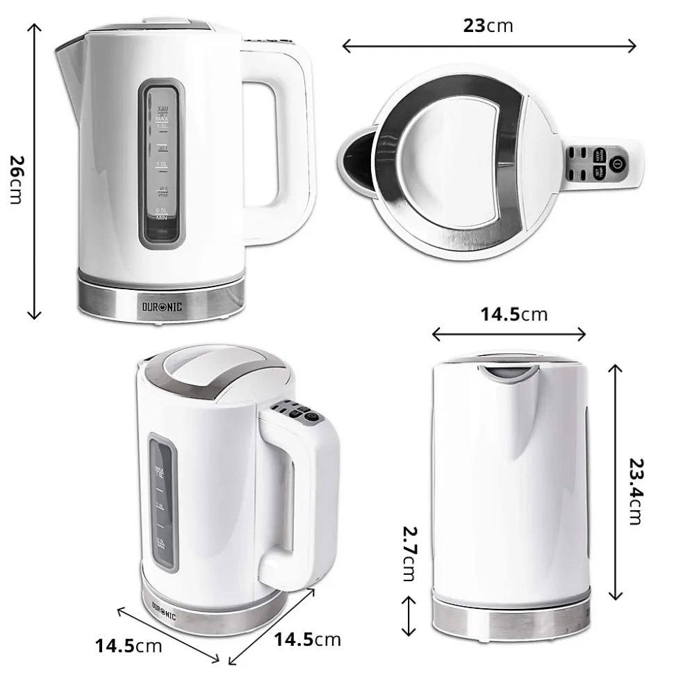 La bouilloire a une puissance de chauffe de 3000W grâce à laquelle votre eau atteindra la température souhaitée plus rapidement : vous consommerez donc moins d’énergie et attendrez moins longtemps ! De plus, cette bouilloire vous permet de sélectionner une température parmi 40° / 60° / 80° / 100° ce qui vous aidera à respecter les recommandations pour chaque boisson. En effet, tous les thés et cafés nécessitent une température différente et bien précise, sans quoi l’arôme est altéré.Avec l’EK30 de Duronic, vous pouvez également décider de garder l’eau à la température sélectionnée pendant 30 minutes. Si, pendant ce délai, la température baisse de 2° alors la bouilloire chauffera l’eau pour que celle-ci revienne à la température souhaitée. Cette fonction est idéale pour les utilisateurs intensifs, ceux qui aiment se servir une deuxième tasse ou les lieux de passage comme un environnement professionnel.La bouilloire bénéficie d’une fenêtre et de mesures sur chaque côté afin qui vous puissiez jauger la quantité d’eau disponible. La base à 360° signifie que la bouilloire peut être posée dans n’importe quel sens: pratique pour les gauchers aussi bien que les droitiers et plus encore pour ceux qui ont du mal à se réveiller. Réalisée en acier inoxydable et en plastique, la bouilloire a une double paroi afin d’éviter les fuites, plutôt communes sur les modèles à simple paroi.Toutes les bouilloires nécessitent un nettoyage régulier afin de retirer les dépôts de calcaire contenu dans l’eau. Pour vous assurer une boisson de qualité, un filtre en acier inoxydable et à mailles fines permet d’écarter certaines impuretés. Cette bouilloire est également équipée d’une protection anti-surchauffe afin qu’elle ne puisse se mettre en route si la quantité d’eau est inférieure à 0,5 L. Ce modèle est disponible en noir et blanc. Idéal pour thés, cafés, chocolats chauds, pâtes, etc.
