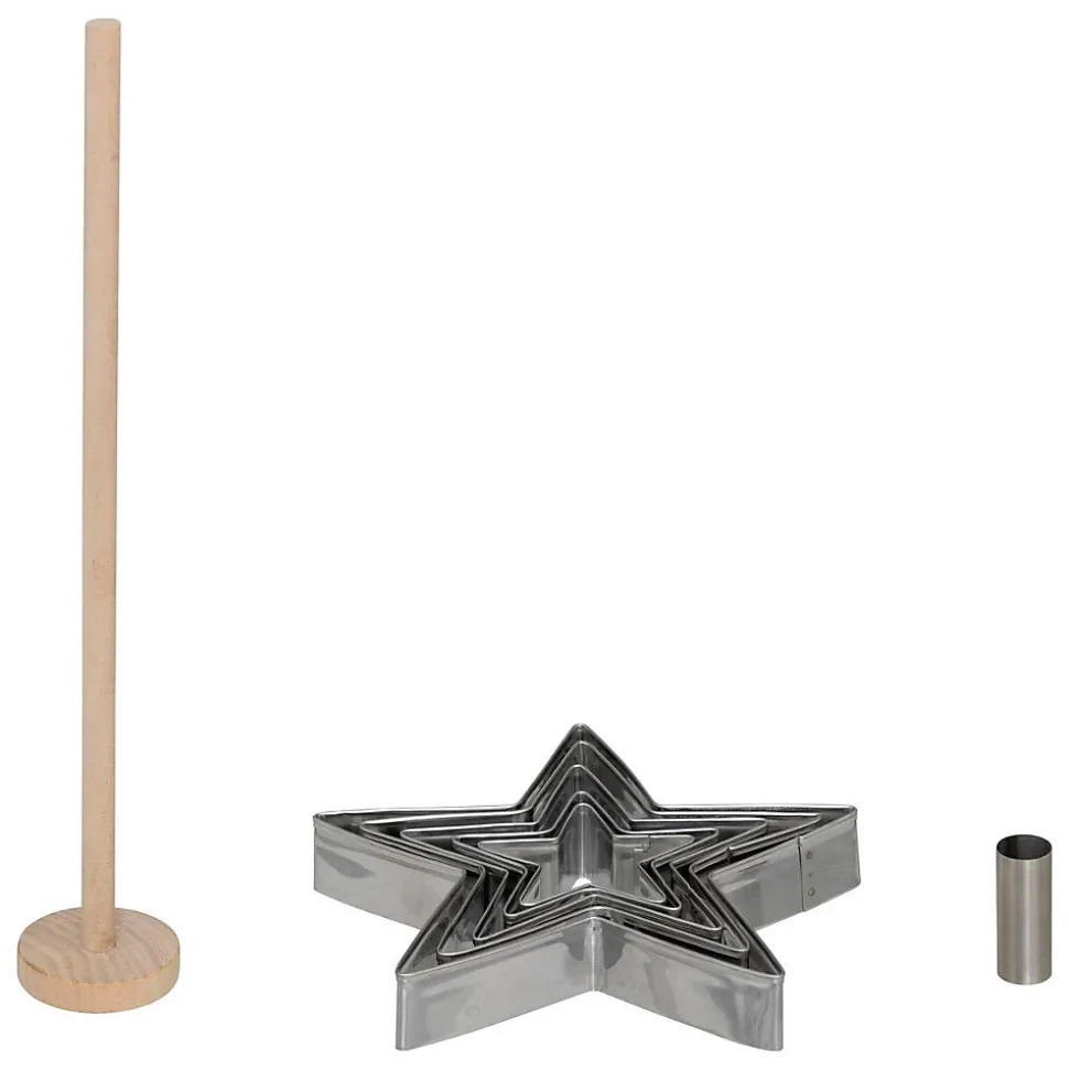 Emporte-pièces étoiles 7 pièces kit NoëlROBUSTE : Set sapin Noël en stainless argent, résistant et pratique, idéal pour découper rapidement des biscuits en forme de sapin.PRATIQUE : Facile à nettoyer et à manipuler pour un usage quotidien ou saisonnier lors des préparations festives.DESIGN : Forme sapin élégante et épurée, apportant un rendu esthétique aux biscuits et aux décorations de Noël.MULTI-USAGE : Parfait pour biscuits, pâte sablée ou pâte à modeler comestible, créant des décorations uniformes et festives.5FIVE SIMPLY SMART : C’est prouvé, une maison bien rangée c’est la garantie d’un esprit léger. 5five propose des solutions intelligentes pour organiser et aménager chaque pièce de la maison, afin de faciliter le quotidien !Contenu : 5 emporte-pièces – 1 cylindre – 1 tige en boisDimensions : L. 16.5 x P. 16.5 x H. 26 cmColoris : ArgentMarque : 5 five simply smart