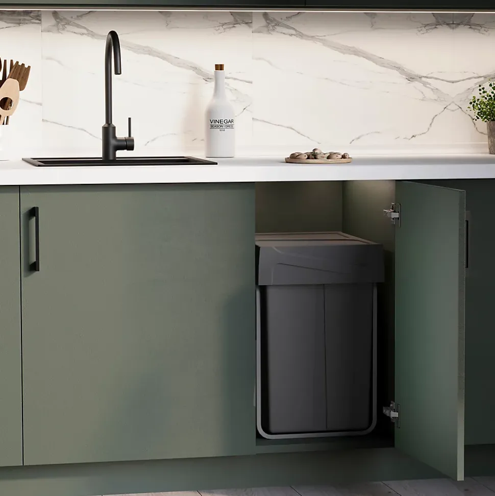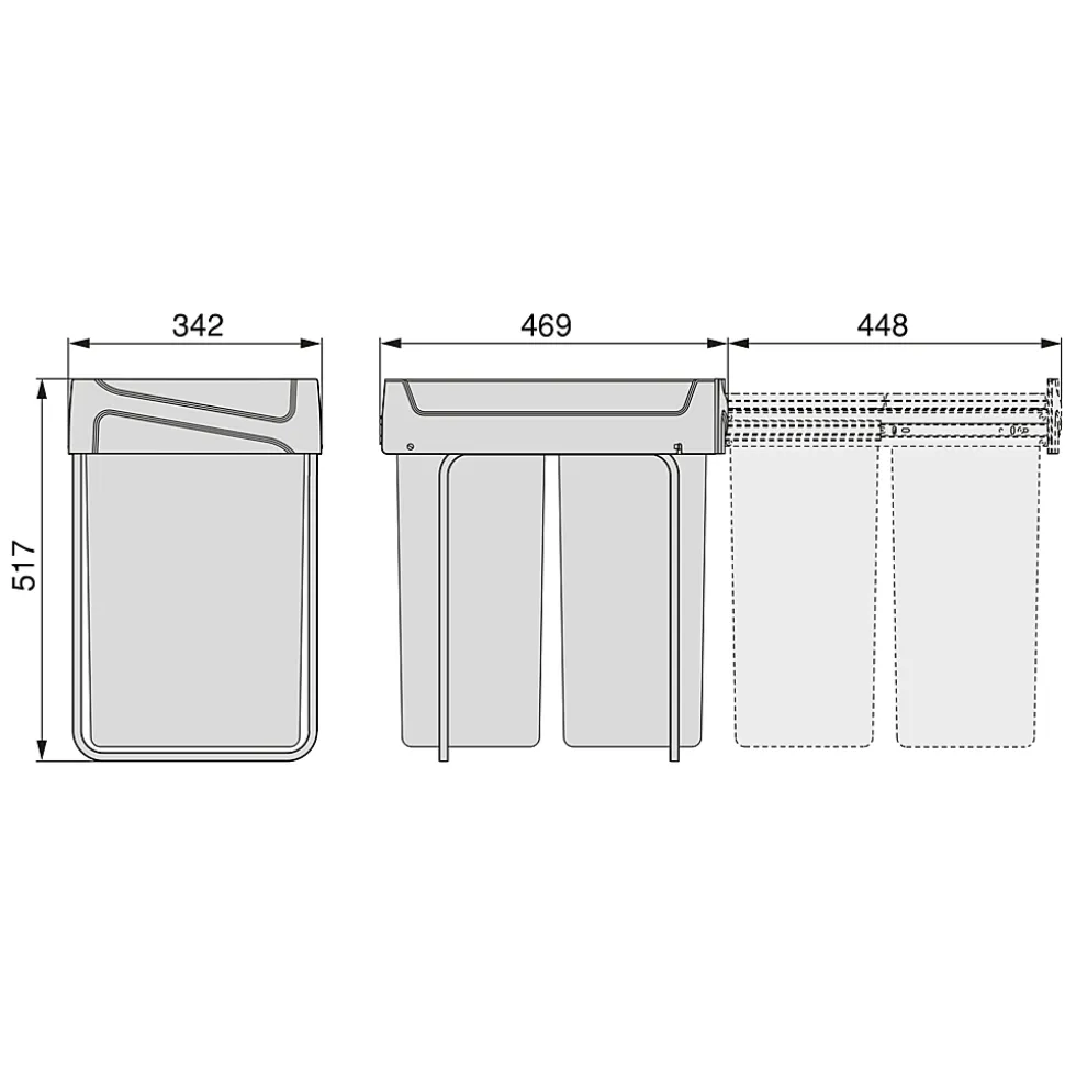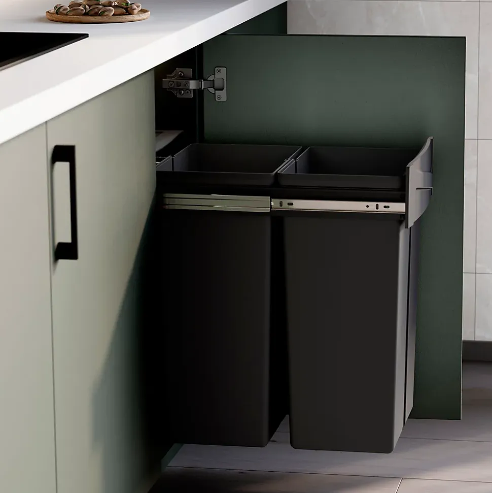 Conteneur de fixation inférieur et extraction manuelle avec une capacité totale jusqu’à 50L.Pour une installation dans des modules avec des dimensions intérieures minimales de: largeur 364 mm, profondeur 500 mm et hauteur 520mm.Comprend deux conteneurs amovibles de 25 litres.Guides à billes totalement amovibles, silencieux avec retenue en caoutchouc à la fermeture.Fabriqué en acier et plastique, finition gris anthracite. VOIR LES MESURES DU PRODUIT DANS LES IMAGES. Poubelle de recyclage amovible idéal pour le recyclage et le tri des déchets ménagers. Conçu pour l’intégration dans les meubles de cuisine offrant un accès plus facile aux poubelles. Il a une capacité total de 50 litres et est valable pour les modules avec des dimensions utiles minimales de 364 mm de large, 500 mm de profondeur et 520mm de hauteur.La structure amovible de cette poubelle est fixée au bas des modules, permettant une extraction totale en douceur manuellement grâce aux glissières à billes qu’elle intègre. Il se caractérise par sa facilité d’installation grâce aux vis incluses dans le produit.L’ensemble comprend deux conteneurs amovibles de 25 litres avec une poignée simple pour un retrait facile. Fabriqué en acier et plastique gris anthracite.