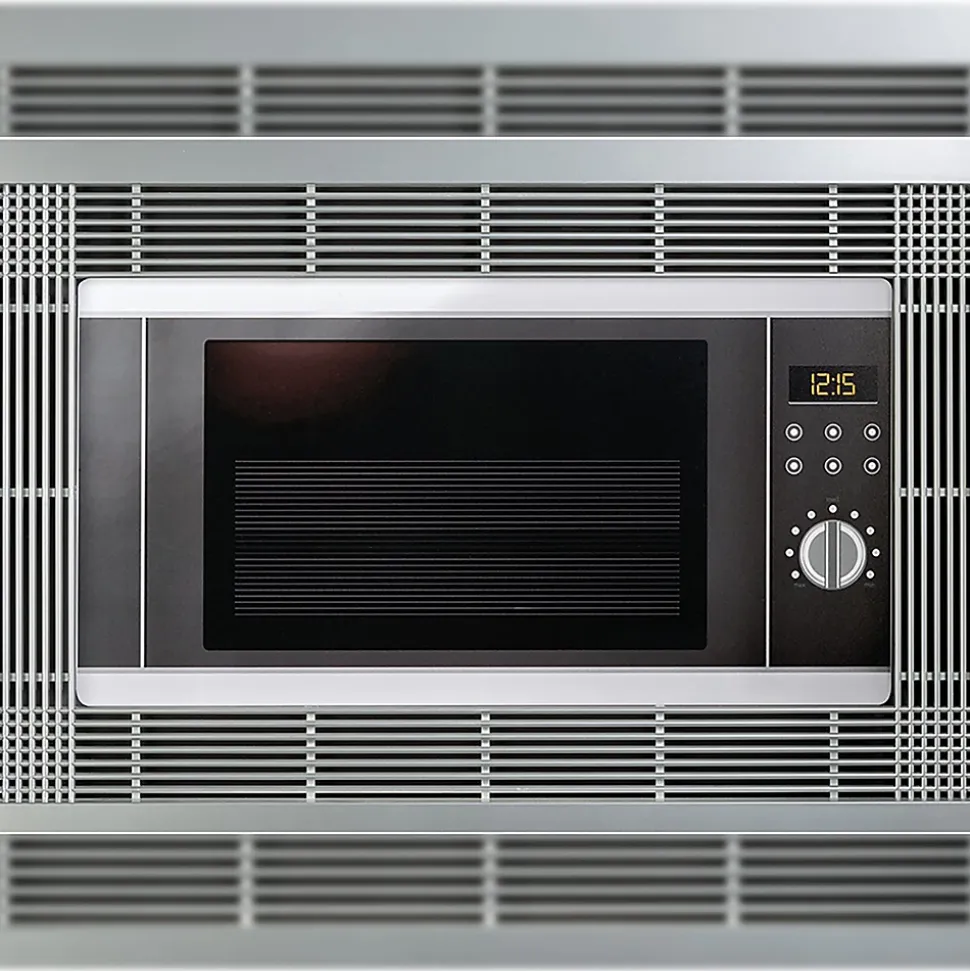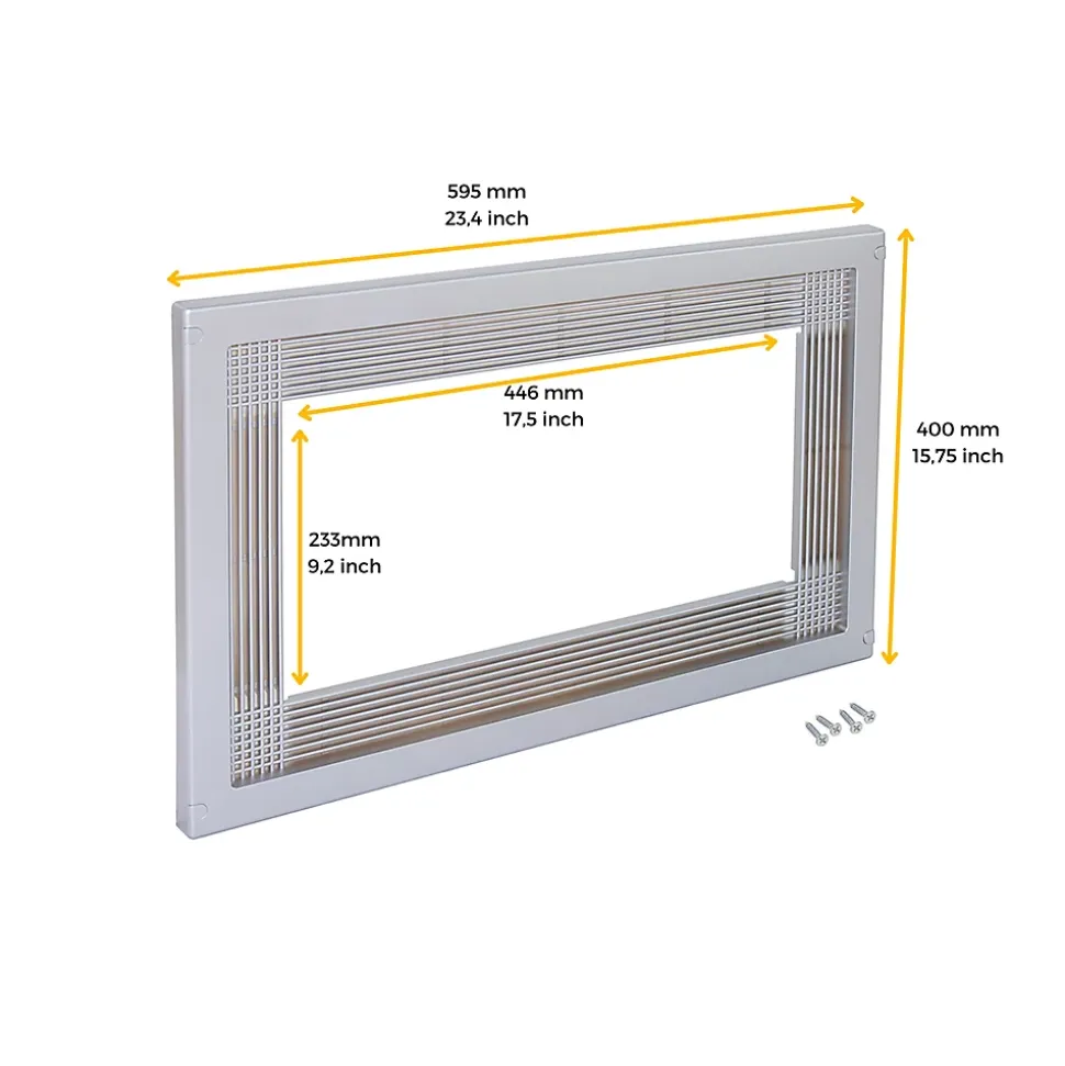 Pour installer sur un module de 600mm de largeur. Fabriqué en plastique peint en gris métallisé. Grillage fin à découper facilement pour l’ajuster au micro-ondes. Fourni avec tout le nécessaire pour son installation : vis, caches, taquets et instructions de montage. VOIR LES MESURES DU PRODUIT DANS LES IMAGES. Cadre pour encastrer le micro-ondes dans un module de cuisine de 600 mm de largeur fabriqué en plastique et avec 3 finitions disponibles : injecté blanc, peint en gris métallisé ou avec recouvrement électrolytique en nickel satiné (effet inox). Dispose d’un grillage fin facile à découper afin de l’ajuster parfaitement à l’appareil et d’obtenir une intégration totale dans le meuble. Fourni avec tout le nécessaire pour le montage afin de faciliter l’installation: vis de fixation, caches pour les vis et 4 taquets pour placer le micro-ondes à la hauteur désirée.