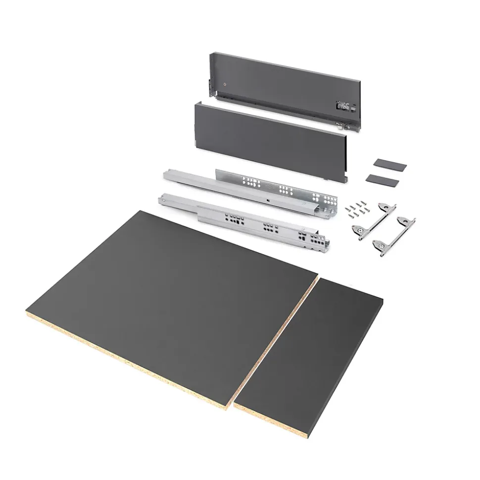 Kit de ferrures nécessarie pour le montage d’un tiroir, hauteur 178 mm et profondeur de 500 mm, à l’exception de la face avant du tiroir, en modules d’une largeur de 450 mm et d’une épaisseur de côté de 16 mm.Coulisses à sortie totale synchronisés, avec fermeture amortie et charge jusqu’à 40 kg.Dimensions panneaux: profondeur 399 x 490 mm et arrière 376 x 148 mm. Possibilité de découper les panneaux pour ajuster la largeur du tiroir à la mesure souhaitée.U dispose d’un réglage frontal en 3D : vertical au moyen d’un excentrique de ±2 mm, horizontal ±1 mm, inclinaison -1,5/+4 mm.Fabriqué en acier peint gris anthracite et aggloméré avec mélamine de la même couleur. VOIR LES MESURES DU PRODUIT DANS LES IMAGES. Kit pour tiroir de cuisine et salle de bain avec tous les éléments nécessaires à son montage. C’est la solution optimale pour vos meubles de cuisine, de salle de bain ou d’armoire avec un design élégant en gris anthracite et blanc. Chaque kit est composé de tous les éléments nécessaires au montage d’un tiroir extérieur de hauteur 178mm et d’une profondeur de 500 mm avec différentes largeurs de modules. Comprend: deux côtés latérales, un ensemble de guides à fermeture amortie, un ensemble de couvre-garnitures, des panneaux inférieur et arrière et des attaches avant de tiroir. Vous aurez simplement besoin du panneau avant avec les dimensions nécessaires du tiroir.Les côtés latérales métalliques sont en acier avec finition peinte gris anthracite et blanc, permettent de régler la façade du tiroir ± 2 mm verticalement, ± 1 mm horizontalement et -1,5/+4 mm en inclinaison. Les guides sont à sortie totale avec fermeture amortie et permettent une charge maximale de 40 Kg pour le tiroir.Les panneaux