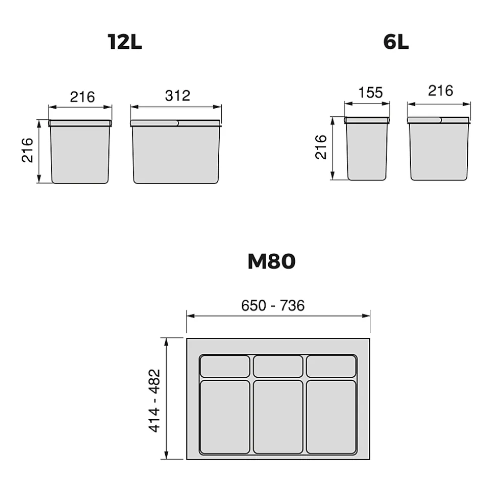 Poubelles de 216 mm de hauteur avec base pour tiroir de module de 800 mm.Le jeu comprend 2 poubelles de 12 litres de capacité et 2 poubelles de 6 litres.Fabriquées en plastique couleur gris anthracite.Base avec bords à découper pour les adapter aux dimensions intérieures du tiroir.Les poubelles sont dotées d’une anse en couleur afin de mieux identifier les déchets, ainsi que pour faciliter leur extraction, et donc leur vidage et nettoyage. VOIR LES MESURES DU PRODUIT DANS LES IMAGES. Les poubelles pour tiroir Recycle Emuca , intégrées dans les meubles de la cuisine, permettent de séparer plus facilement les déchets de façon discrète et organisée. Elles sont compatibles avec des modules de 60 cm, 80 cm et 90 cm de largeur, et sont disponibles en deux hauteurs, permettant plusieurs configurations avec une capacité utile de 24 litres à 44 litres.Elles sont compatibles avec toute sorte de tiroirs grâce à leurs bases à découper, qui s’adaptent parfaitement à l’espace utile. Ces poubelles sont dotées d’une anse colorée afin de mieux identifier les déchets, ainsi que pour faciliter leur extraction, et donc leur vidage et nettoyage.