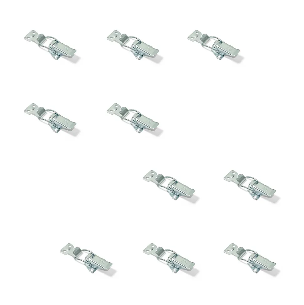 Lot de 10 fermetures à levier pour meubles en acier zingué, permettant une fixation mécanique avec tenseur réglable pour un maintien sécurisé des panneaux. Installation vissée avec distance d’installation de 52 mm. Produit robuste, facile à installer et durable.