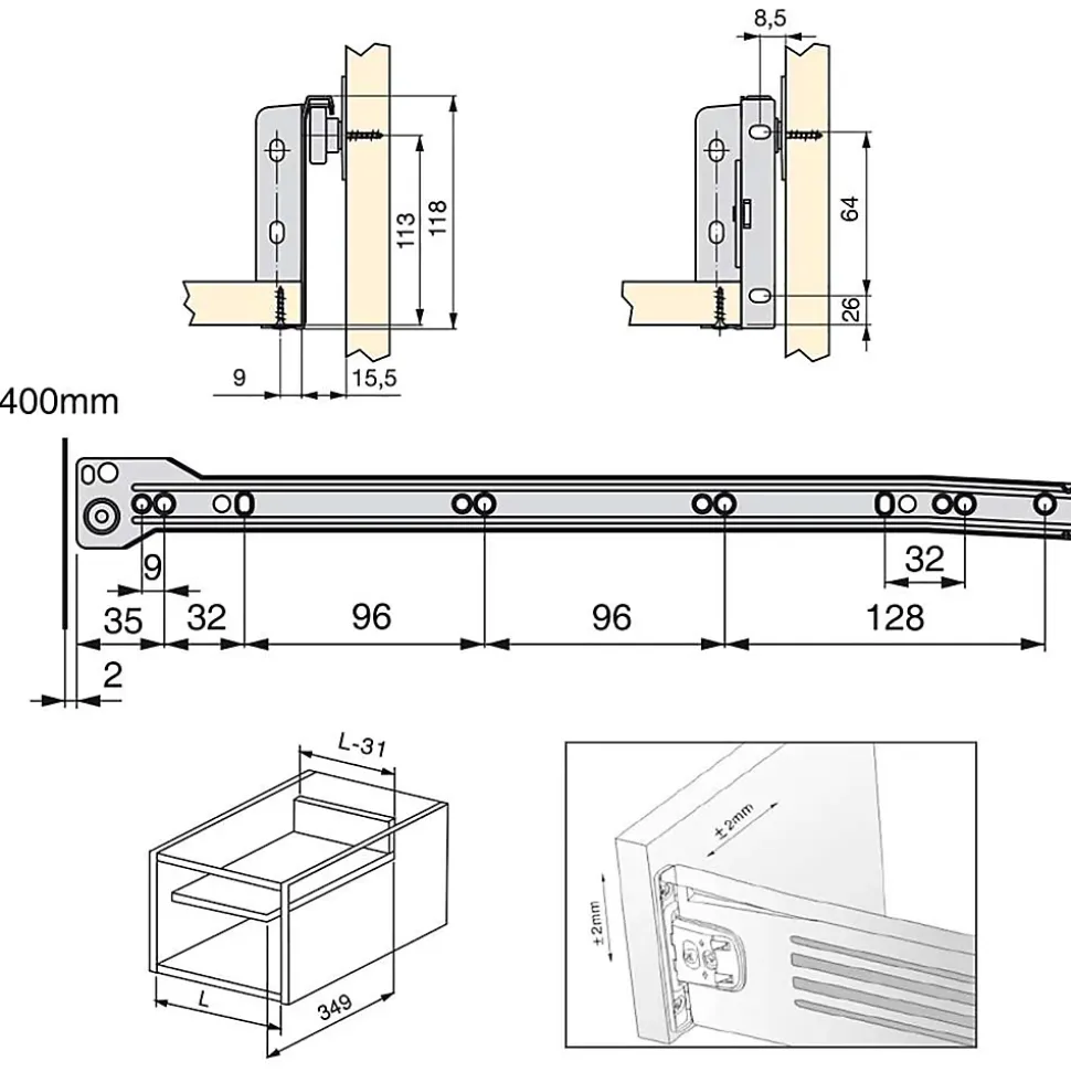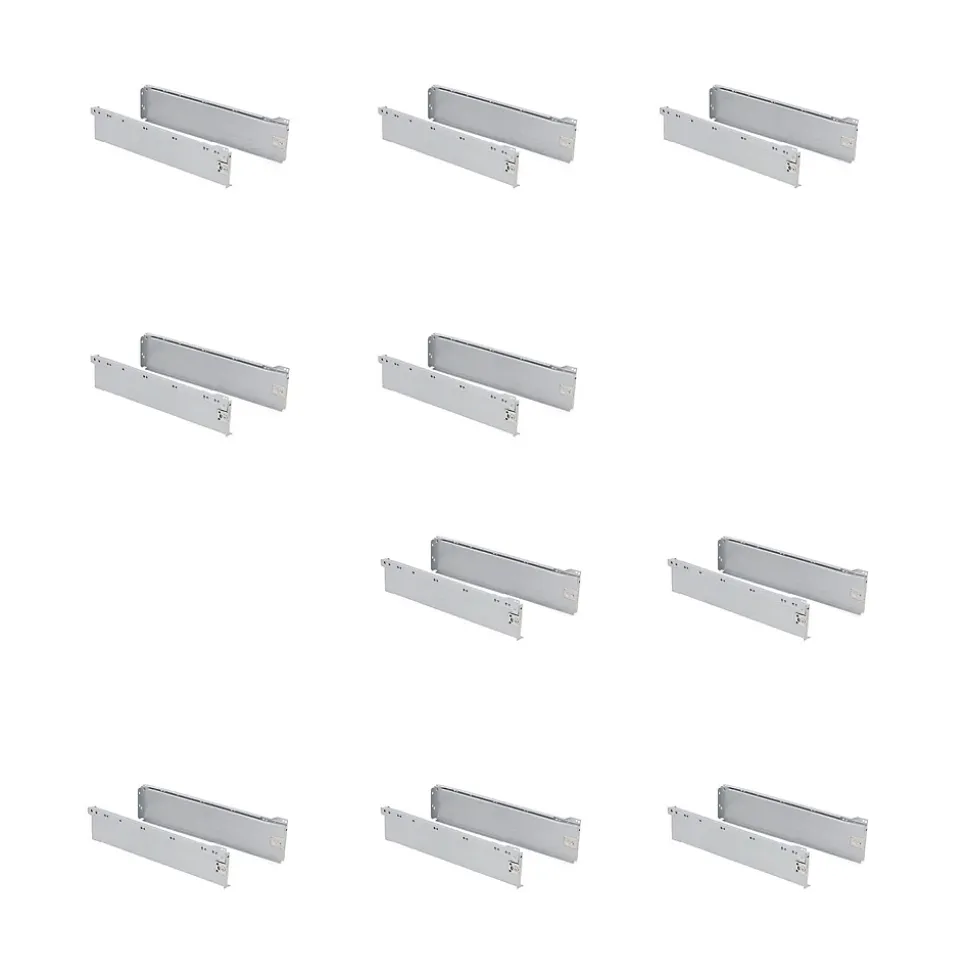 Tiroir Ultrabox pour la cuisine et la salle de bain avec côtés en acier et coulisses à roulettes en acier finition aluminium peint. Il s’agit de la meilleure option avec le meilleur rapport qualité-prix pour les tiroirs de la cuisine et de la salle de bain. Le kit contient tous les accessoires pour le montage d’un tiroir : côtés, jeu de coulisses et fixations frontales. Les panneaux pour la base, la façade arrière et la façade du tiroir, à couper aux dimensions correctes, ne sont pas inclus.Fixations frontales fournies sont déjà montées sur les côtés métallique et permettent un réglage excentrique de ±2 mm à la verticale. Tiroir en acier composé de deux côtés et coulisses à roulettes à fermeture avec chute. Hauteur du côté 118 mm et profondeur 400 mm. Le fond ne requiert pas d’usinage. Capacité de fixation améliorée sur le côté. Fourni avec fixation prémontée sur le côté. Réglage à excentrique ±2 mm à la verticale. Capacité de charge maximum 25 kg. Fabriqué en acier peint gris métallisé RAL 9022. Possibilité de montage avec fermeture amortie (non incluse). VOIR LES MESURES DU PRODUIT DANS LES IMAGES.