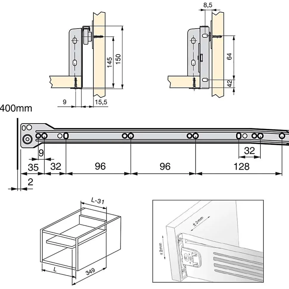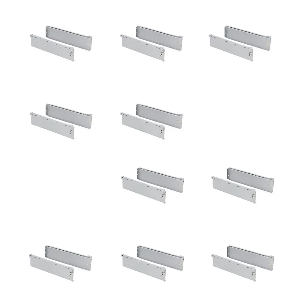 Tiroir Ultrabox pour la cuisine et la salle de bain avec côtés en acier et coulisses à roulettes en acier finition aluminium peint. Il s’agit de la meilleure option avec le meilleur rapport qualité-prix pour les tiroirs de la cuisine et de la salle de bain. Le kit contient tous les accessoires pour le montage d’un tiroir : côtés, jeu de coulisses et fixations frontales. Les panneaux pour la base, la façade arrière et la façade du tiroir, à couper aux dimensions correctes, ne sont pas inclus.Fixations frontales fournies sont déjà montées sur les côtés métallique et permettent un réglage excentrique de ±2 mm à la verticale. Tiroir en acier composé de deux côtés et coulisses à roulettes à fermeture avec chute. Hauteur du côté 150 mm et profondeur 400 mm. Le fond ne requiert pas d’usinage. Capacité de fixation améliorée sur le côté. Fourni avec fixation prémontée sur le côté. Réglage à excentrique ±2 mm à la verticale. Capacité de charge maximum 25 kg. Fabriqué en acier peint gris métallisé RAL 9022. Possibilité de montage avec fermeture amortie (non incluse). VOIR LES MESURES DU PRODUIT DANS LES IMAGES.