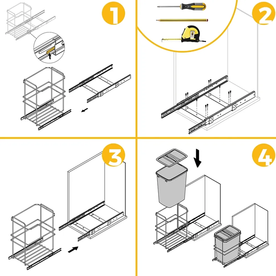 Conteneur de recyclage amovible qui permet de séparer et de classer les déchets ménagers.Il a des guides à billes avec extraction totale et fermeture en douceur pour un accès manuel facile.Il est facile à installer en le vissant au bas du module avec les vis incluses dans le produit.Il est valable pour une installation dans des modules avec des mesures internes minimales de largeur 264 mm, profondeur 460 mm et hauteur 528 mm.Il est fait d’acier et de plastique dans une finition gris anthracite. Il dispose d´une poubelle d’une capacité de 35 litres. VOIR LES MESURES DU PRODUIT DANS LES IMAGES. Le bac de recyclage amovible Recycle est idéal pour séparer et classer les déchets ménagers. Sa structure est dotée de guides à billes à extraction totale et fermeture amortie pour un accès manuel aux seaux.Il se caractérise par sa facilité d’installation vissé sur la partie inférieure du module avec les vis incluses dans le produit. Il est valable pour les modules dont les dimensions utiles minimales sont de 264 mm de large, 460 mm de profondeur et 528 mm de haut.Il dispose de un poubelle d’une capacité de 35 litres. Il est fait d’acier et de plastique avec une élégante finition gris anthracite.