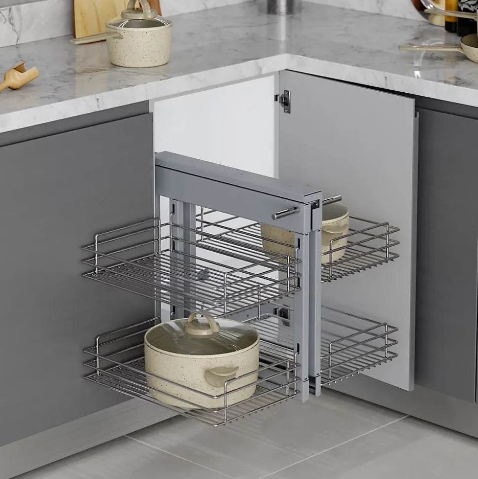 Meuble d’angle à charnières pour optimiser l’espace dans les meubles d’angle de la cuisine.Les 4 paniers s’ouvrent complètement pour faciliter l’accès aux ustensiles et le système comprend une fermeture en douceur.Il peut être assemblé pour s’ouvrir à droite ou à gauche.Le système se compose d’un cadre et de 4 paniers en acier chromé. Il a une capacité de charge allant jusqu’à 30 kg de poids répartis de chaque côté.Dimensions : 530 mm (profondeur) x 700 mm (largeur) x 600 mm (hauteur) et matériel de montage inclus. Largeur de la porte 450 mm. VOIR LES MESURES DU PRODUIT DANS LES IMAGES. Meuble d’angle articulé coulissant Suprastar. Le meuble d’angle est conçu pour optimiser l’espace des coins et organiser toutes sortes de produits dans votre cuisine. Grâce à ses 4 paniers de grande capacité, vous pouvez ranger n’importe quel accessoire. A noter que le système Suprastar permet d’extraire les 4 paniers depuis l’intérieur du module pour atteindre et présenter rapidement n’importe quel accessoire. Son installation est très simple, vous pouvez choisir de monter l’unité d’angle pour une ouverture à droite ou à gauche. De plus, il comprend un système de fermeture en douceur.Sa capacité de charge est de 15 kg par chariot et de 30 kg au total.La structure est en acier et peinte en gris, tandis que les quatre paniers ont une finition chromée brillante pour une plus grande durabilité.Pour l’installation, un module aux dimensions minimales suivantes est nécessaire : 530 mm (profondeur) x 700 mm (largeur) x 600 mm (hauteur) et une largeur de porte de 450 mm.