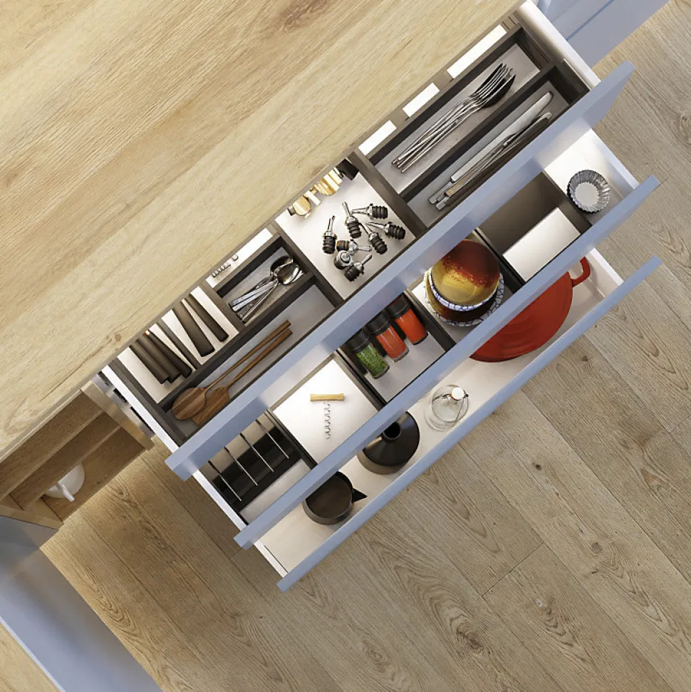 Kit de ferrures nécessaires pour le montage d’un tiroir extérieur de hauteur 93 mm et profondeur 400 mm, n’incluant pas le fond, la façade ni la façade arrière. Contient les coulisses à sortie totale, un jeu de côtés, un jeu de fixations arrière et un jeu de fixations frontales pour tiroir extérieur. Les coulisses, à extraction totale et fermeture amortie, offrent une capacité de charge maximum de 30 kg. U dispose d’un réglage frontal: vertical au moyen d’un excentrique de ±2 mm et horizontal ±1 mm. Fabriquées en acier peint blanc. VOIR LES MESURES DU PRODUIT DANS LES IMAGES. Le tiroir de cuisine et salle de bain Protone est disponible en kit avec toutes les ferrures nécessaires pour le montage et offre une grande capacité de charge, jusqu’à 30 kg par tiroir. Le kit contient les coulisses à sortie totale et fermeture amortie , un jeu de fixations et un jeu de côtés , disponibles en finition blanc ou gris anthracite. Vous n’aurez qu’à ajouter les panneaux pour le fond, la façade arrière et la façade du tiroir, avec les dimensions correctes.