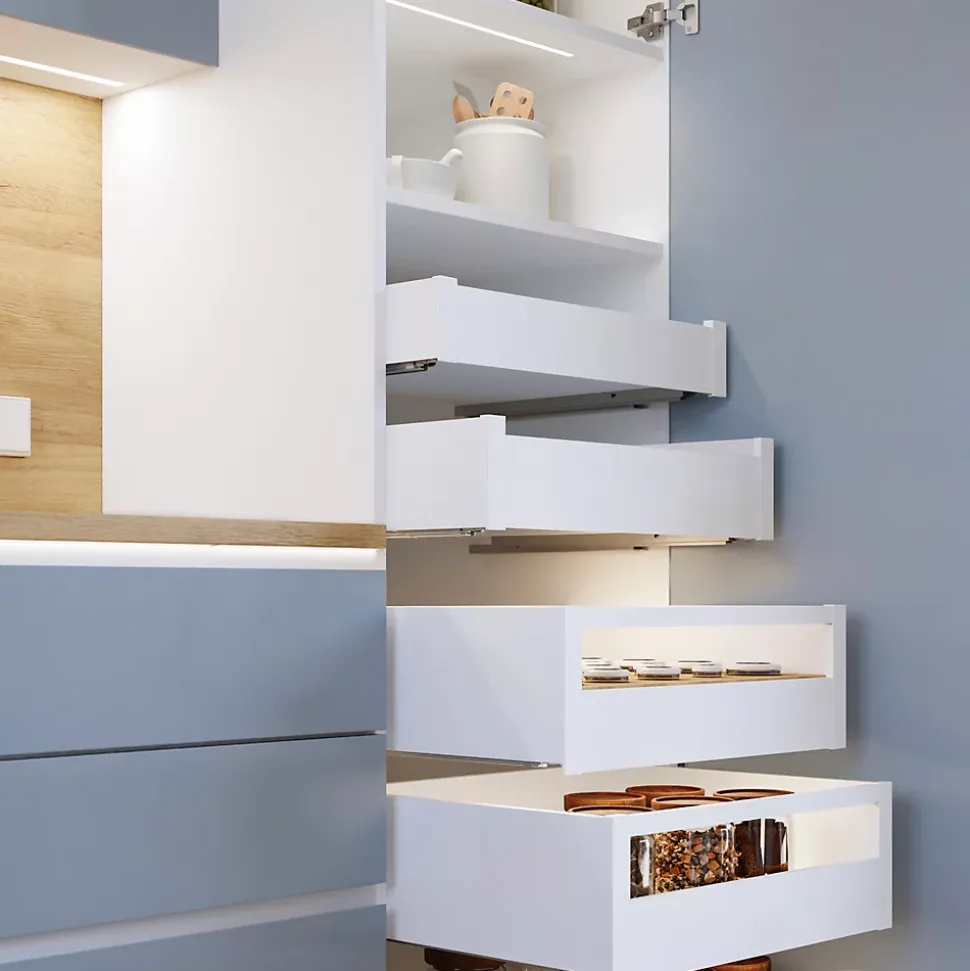 Kit de ferrures nécessaires pour le montage d’un tiroir extérieur de hauteur 93 mm et profondeur 450 mm, n’incluant pas le fond, la façade ni la façade arrière. Contient les coulisses à sortie totale, un jeu de côtés, un jeu de fixations arrière et un jeu de fixations frontales pour tiroir extérieur. Les coulisses, à extraction totale et fermeture amortie, offrent une capacité de charge maximum de 30 kg. U dispose d’un réglage frontal: vertical au moyen d’un excentrique de ±2 mm et horizontal ±1 mm. Fabriquées en acier peint blanc. VOIR LES MESURES DU PRODUIT DANS LES IMAGES. Le tiroir de cuisine et salle de bain Protone est disponible en kit avec toutes les ferrures nécessaires pour le montage et offre une grande capacité de charge, jusqu’à 30 kg par tiroir. Le kit contient les coulisses à sortie totale et fermeture amortie , un jeu de fixations et un jeu de côtés , disponibles en finition blanc ou gris anthracite. Vous n’aurez qu’à ajouter les panneaux pour le fond, la façade arrière et la façade du tiroir, avec les dimensions correctes.