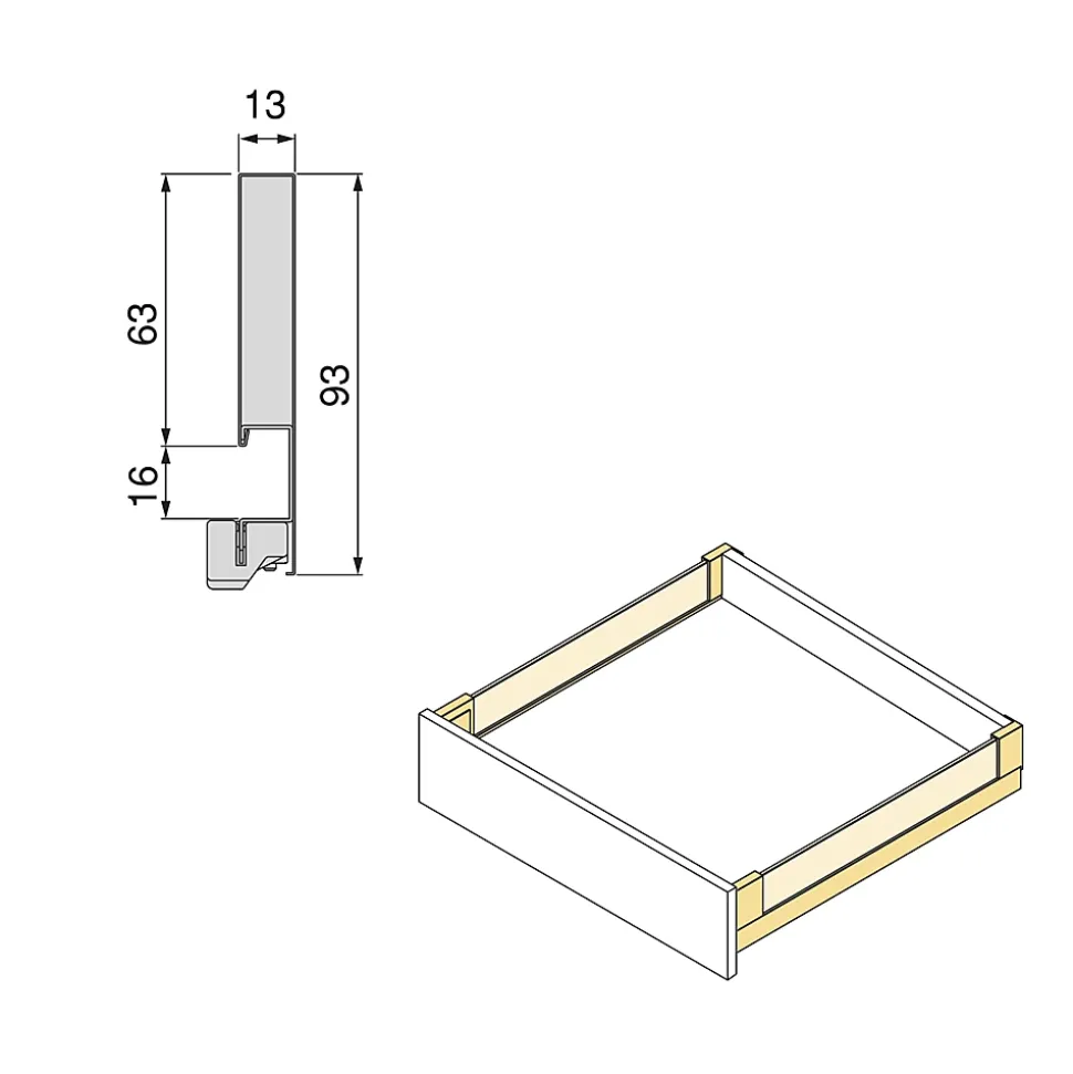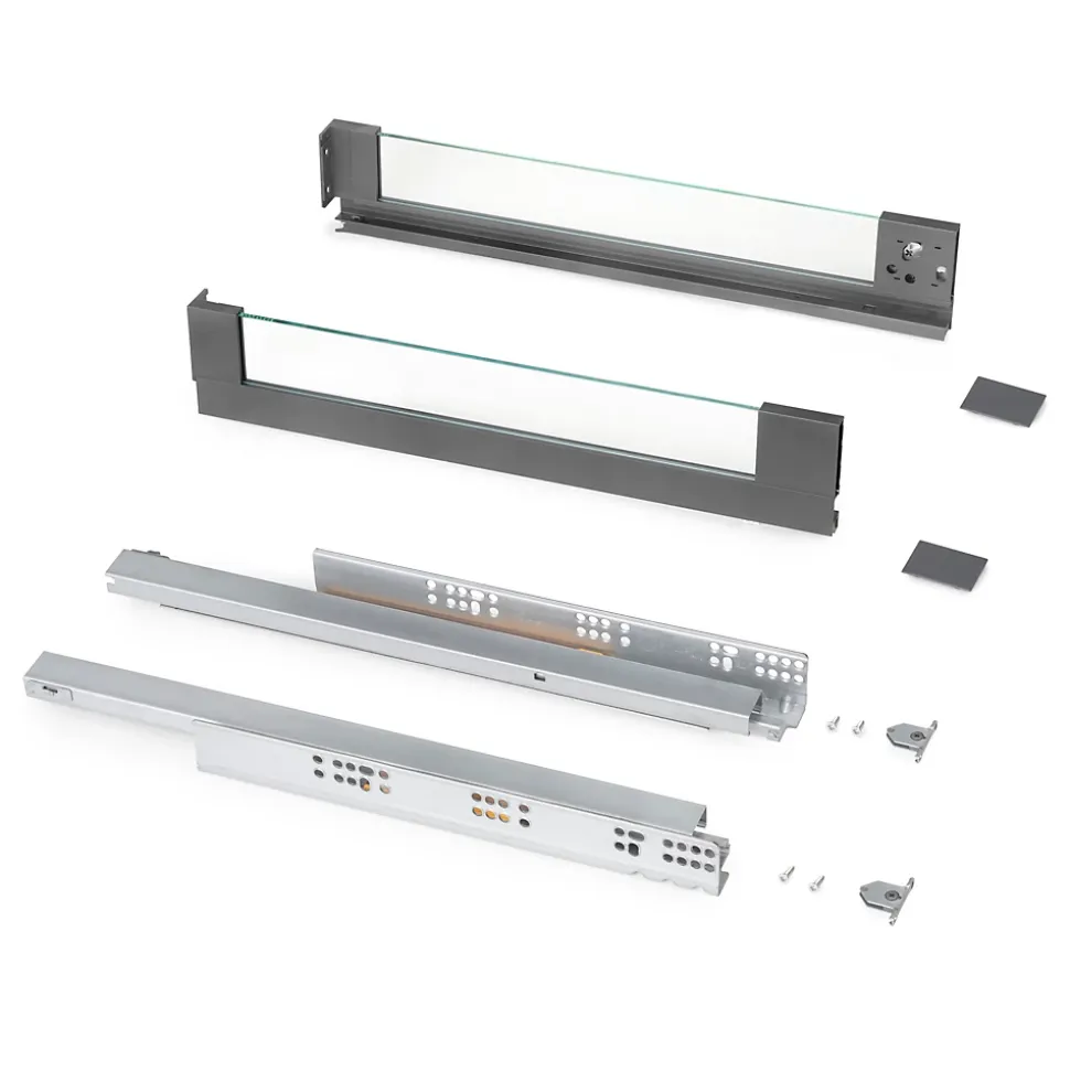 Kit tiroir Vertex avec côtés en verre de 6 mm d’épaisseur, transparent et trempé.Le kit est composé de toute la quincaillerie nécessaire au montage d’un tiroir de hauteur 93 mm et de profondeur 500 mm, à l’exception de la bordure, du dos et du fond.Guides d’extraction totale synchronisés, avec fermeture amortie et capacité de charge de 40 kg.Il dispose d’un réglage excentrique de la façade du tiroir : ±2 mm verticalement et ±1 horizontalement.Fabriqué en acier et aluminium peint en gris anthracite. VOIR LES MESURES DU PRODUIT DANS LES IMAGES. Tiroir Vertex avec côtés en verre transparent destiné à vos meubles de cuisine. Ils offrent un design élégant aux lignes droites en gris anthracite qui sont disponibles en différentes hauteurs et profondeurs de tiroir.Les côtés en verre utilisés dans le tiroir sont en verre trempé et ont une épaisseur de 6 mm. Les glissières sont à sortie totale avec fermeture souple et permettent une charge maximale de 40 kg. Elles permettent également un ajustement de la façade du tiroir de ±2 mm verticalement et ±1 mm horizontalement.Le tiroir Vertex avec côtés en verre est composé de tous les éléments nécessaires au montage. Vous n’aurez besoin que des planches coupées aux bonnes dimensions pour le fond, le dos et le bord du tiroir.Comprend des glissières, un ensemble de nervures avec des côtés en verre, un ensemble de couvercles de garniture et un ensemble de crochets frontaux pour le tiroir extérieur.Les côtés sont fabriquées en acier et en aluminium peint et dimensionnées pour une épaisseur de panneau de 16 mm pour le fond et l’arrière du tiroir.