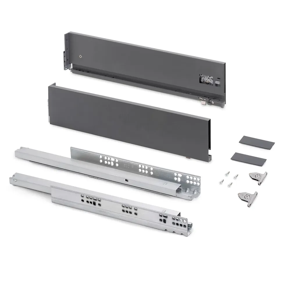 Kit pour tiroir de cuisine et salle de bain Vertex avec tous les éléments nécessaires à son montage. C’est la solution optimale pour vos meubles de cuisine, de salle de bain ou d’armoire avec un design élégant en gris anthracite. Hauteur 131 mm, profondeur 450 mm, capacité 40 kg, acier finition gris anthracite. Inclut guides à fermeture amortie, côtés latéraux, attaches et vis. Compatible panneaux épaisseur 16 mm.