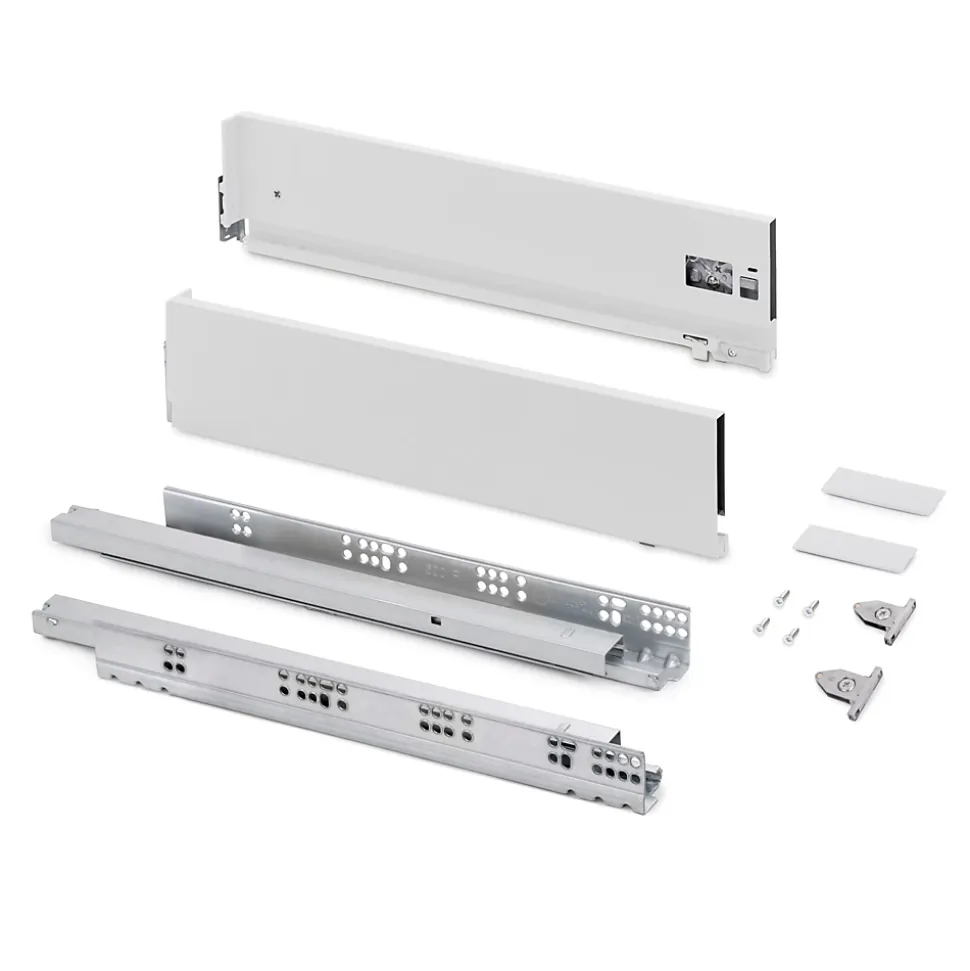 Kit de ferrures nécessaires pour le montage d’un tiroir extérieur de hauteur 131 mm et profondeur 500 mm, n’incluant pas le fond, la façade ni la façade arrière.Dimensionnées pour une épaisseur de panneau de 16 mm pour le fond et l’arrière du tiroir.Coulisses à sortie totale synchronisés, avec fermeture amortie et charge jusqu’à 60 kg.U dispose d’un réglage frontal en 3D : vertical au moyen d’un excentrique de ±2 mm, horizontal ±1 mm, inclinaison -1,5/+4 mm.Fabriquée en acier peint en blanc. VOIR LES MESURES DU PRODUIT DANS LES IMAGES. Kit pour tiroir de cuisine et salle de bain Vertex avec tous les éléments nécessaires à son montage. C’est la solution optimale pour vos meubles de cuisine, de salle de bain ou d’armoire avec un design élégant. Chaque kit est composé de tous les éléments nécessaires au montage d’un tiroir extérieur de hauteur 131mm, dimensionnées pour une épaisseur de panneau de 16mm pour le fond et l’arrière du tiroir. Comprend: deux côtés latérales, un ensemble de guides à fermeture amortie, un ensemble de couvre-garnitures et des attaches avant de tiroir.Les côtés latérales métalliques sont en acier avec finition peinte en gris anthracite, permettent d’un réglage frontal en 3D : vertical au moyen d’un excentrique de ±2 mm, horizontal ±1 mm, inclinaison -1,5/+4 mm. Les guides sont à sortie totale avec fermeture amortie et permettent une charge maximale de 60kg pour le tiroir.Vous n’aurez qu’à ajouter les panneaux pour le fond, la façade arrière et la façade du tiroir, avec les dimensions correctes.