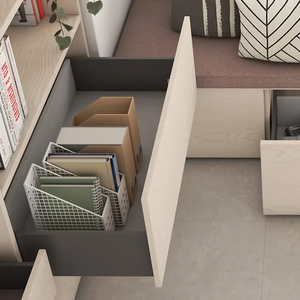 - Coulisses à fermeture progressive assurant une ouverture et fermeture silencieuses et contrôlées.