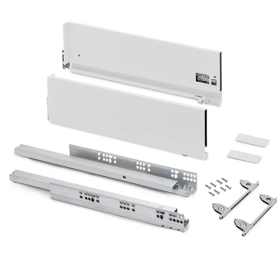 Kit de ferrures nécessaires pour le montage d’un tiroir extérieur de hauteur 178 mm et profondeur 550 mm, n’incluant pas le fond, la façade ni la façade arrière.Dimensionnées pour une épaisseur de panneau de 16 mm pour le fond et l’arrière du tiroir.Coulisses à sortie totale synchronisés, avec fermeture amortie et charge jusqu’à 40 kg.U dispose d’un réglage frontal en 3D : vertical au moyen d’un excentrique de ±2 mm, horizontal ±1 mm, inclinaison -1,5/+4 mm.Fabriquées en acier peint blanc. VOIR LES MESURES DU PRODUIT DANS LES IMAGES. Kit pour tiroir de cuisine et salle de bain Vertex avec tous les éléments nécessaires à son montage. C’est la solution optimale pour vos meubles de cuisine, de salle de bain ou d’armoire avec un design élégant. Chaque kit est composé de tous les éléments nécessaires au montage d’un tiroir extérieur de hauteur 178mm, dimensionnées pour une épaisseur de panneau de 16mm pour le fond et l’arrière du tiroir. Comprend: deux côtés latérales, un ensemble de guides à fermeture amortie, un ensemble de couvre-garnitures et des attaches avant de tiroir.Les côtés latérales métalliques sont en acier avec finition peinte en gris anthracite, permettent d’un réglage frontal en 3D : vertical au moyen d’un excentrique de ±2 mm, horizontal ±1 mm, inclinaison -1,5/+4 mm. Les guides sont à sortie totale avec fermeture amortie et permettent une charge maximale de 40 Kg pour le tiroir.Vous n’aurez qu’à ajouter les panneaux pour le fond, la façade arrière et la façade du tiroir, avec les dimensions correctes.