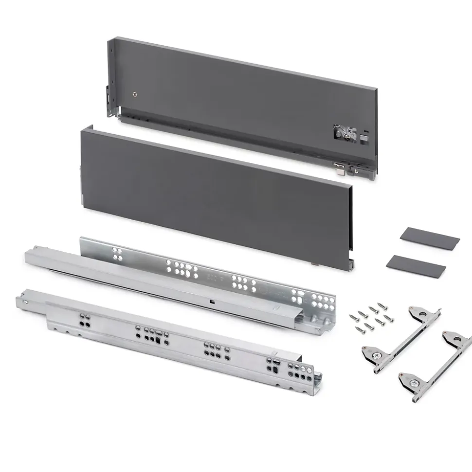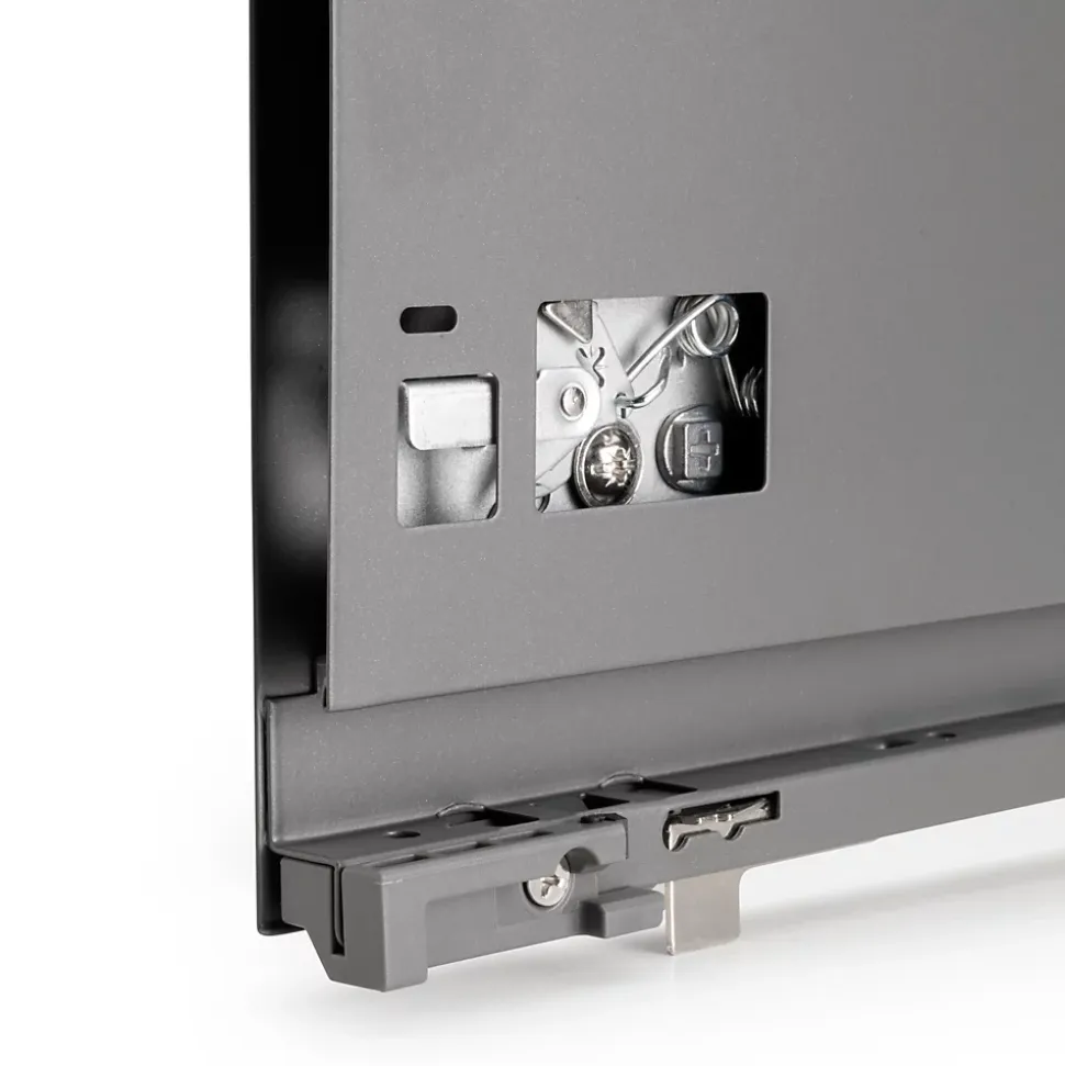 Kit complet pour montage de tiroir extérieur Vertex hauteur 178 mm, compatible avec panneaux de 16 mm d’épaisseur. Inclut coulisses à sortie totale avec fermeture amortie, côtés latéraux en acier gris anthracite avec réglage 3D, couvre-garnitures et attaches avant. Charge maximale 60 kg. Design élégant gris anthracite et installation simplifiée grâce au système EMUCA.
