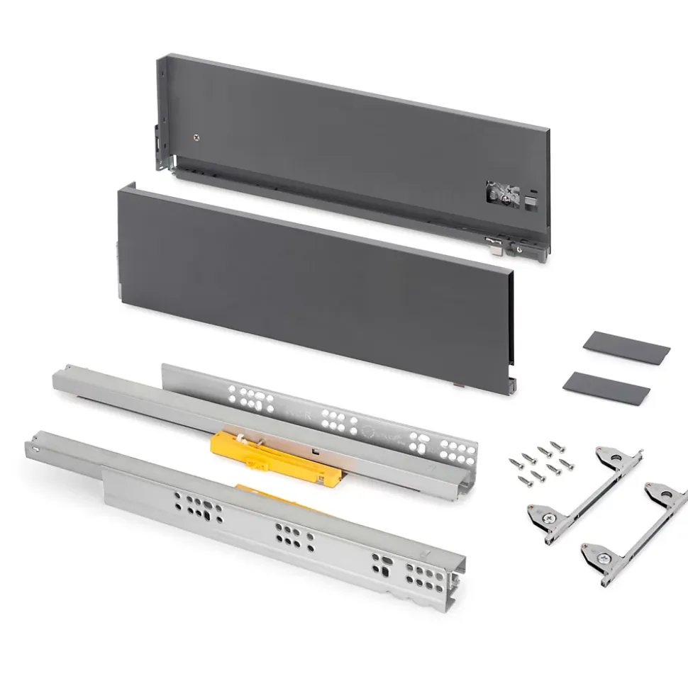 Kit de quincaillerie nécessaire au montage d’un tiroir Push Synchro de hauteur 178 mm et de profondeur 350 mm, à l’exception du bord, du dos et du fond.Guides d’extraction totale synchronisés. Capacité de charge de 40 kg.U dispose d’un réglage frontal en 3D : vertical au moyen d’un excentrique de ±2 mm, horizontal ±1 mm, inclinaison -1,5/+4 mm.Les guides sont adaptés pour le montage de la tige de synchronisation (non incluse dans le kit).Fabriquée en acier peint gris anthracite. VOIR LES MESURES DU PRODUIT DANS LES IMAGES.