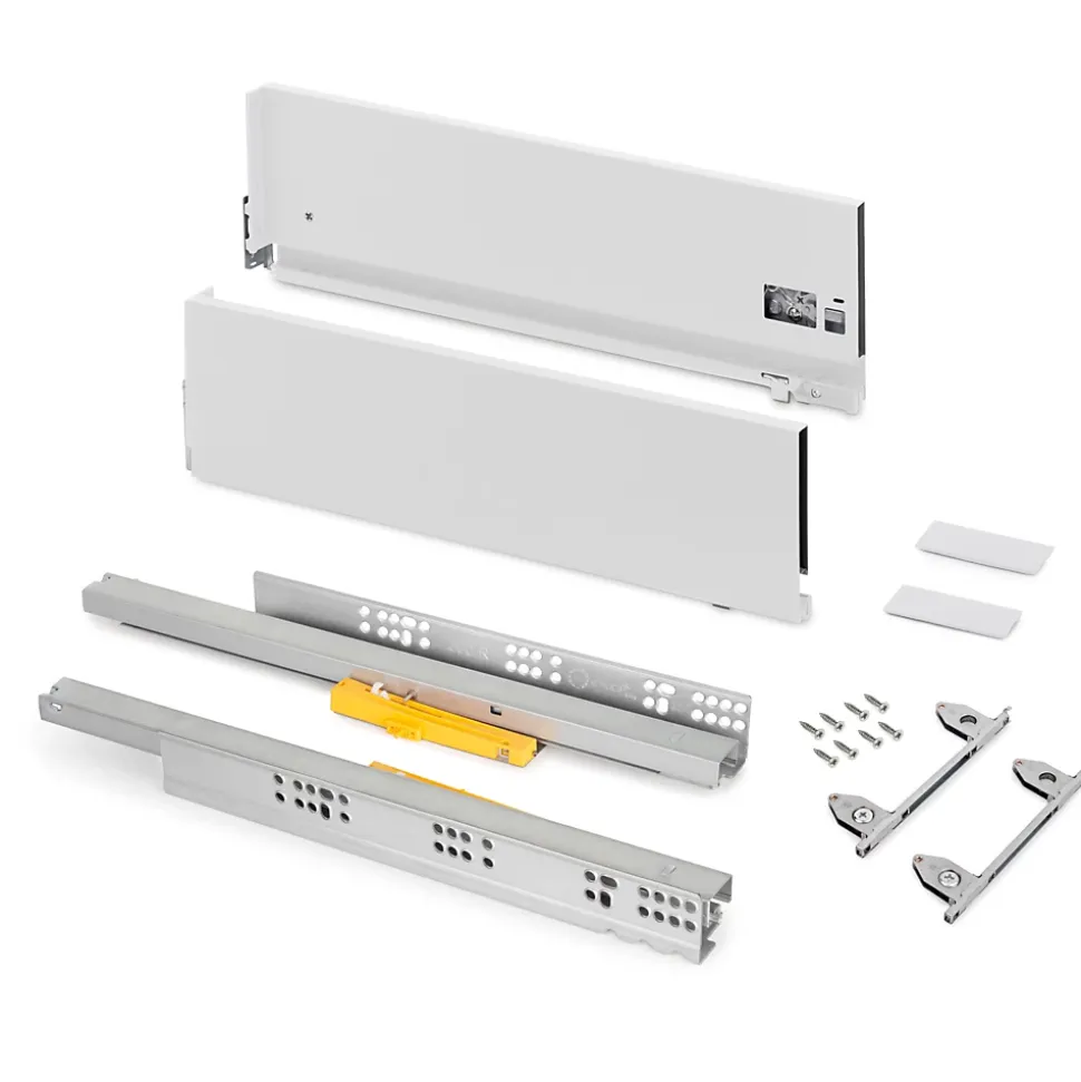 Kit de quincaillerie nécessaire au montage d’un tiroir Push Synchro de hauteur 178 mm et de profondeur 500 mm, à l’exception du bord, du dos et du fond.Guides d’extraction totale synchronisés. Capacité de charge de 40 kg.U dispose d’un réglage frontal en 3D : vertical au moyen d’un excentrique de ±2 mm, horizontal ±1 mm, inclinaison -1,5/+4 mm.Les guides sont adaptés pour le montage de la tige de synchronisation (non incluse dans le kit).Fabriqué en acier peint en blanc. VOIR LES MESURES DU PRODUIT DANS LES IMAGES.