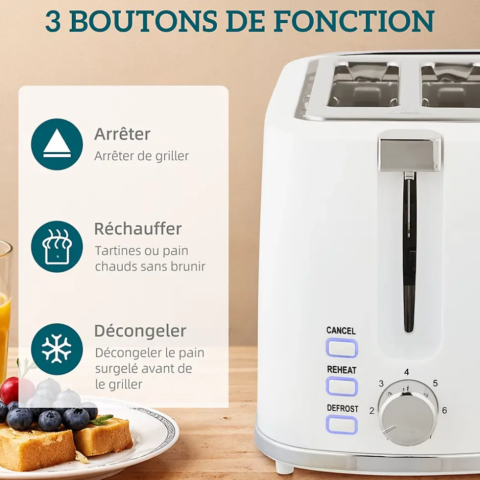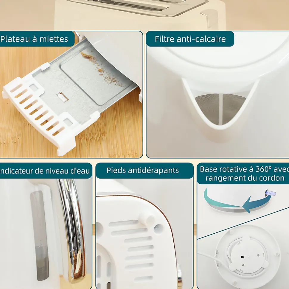 Démarrez vos journées avec l’ensemble bouilloire et grille-pain HOMCOM, comprenant une bouilloire de 1,7L avec thermostat Otter et un grille-pain à deux fentes. La bouilloire rapide et sûre possède des fonctions d’arrêt automatique et de protection contre la surchauffe. Le grille-pain blanc propose sept niveaux de dorage, parfait pour tout type de pain. Cet ensemble élégant optimise et embellit votre routine matinale.Caractéristiques :- Ensemble de bouilloire et grille-pain rehausse votre cuisine avec un style moderne- Fait bouillir l’eau en quelques minutes avec une puissance de 2200W, convient aux matins chargés- Capacité généreuse de 1,7L pour répondre aux besoins de la famille, avec une fenêtre d’eau pratique- Profitez d’un toast optimal avec 7 niveaux de brunissage et des boutons de fonction faciles à utiliser- Arrêt automatique, protection contre l’ébullition à sec et la surchauffe garantissent une utilisation sûre et sans souci- Base de la bouilloire électrique à 360° avec rangement intégré pour le cordon maintient votre espace de cuisine ordonné- Bac à miettes amovible et filtre anticalcaire pour un nettoyage facileSpécifications :- Couleurs : blanc, argent- Matériaux : PP, acier- Dim. bouilloire : 22,2L x 16,7l x 23,2H cm- Dim. grille-pain : 26,6L x 16,4l x 18,3H cm- Dim. base de la bouilloire : Ø 15,6 x 1,5H cm- Dim. fente du grille-pain : 13,5L x 3,5l x 13,5H cm- Capacité de la bouilloire : 1,7 l- Puissance de la bouilloire : 1850-2200 W- Puissance du grille-pain : 920-1080 W- Tension : 220-240 V, 50/60 Hz- Longueur du câble : 0,7 m- Réf. : 800-283V90WT