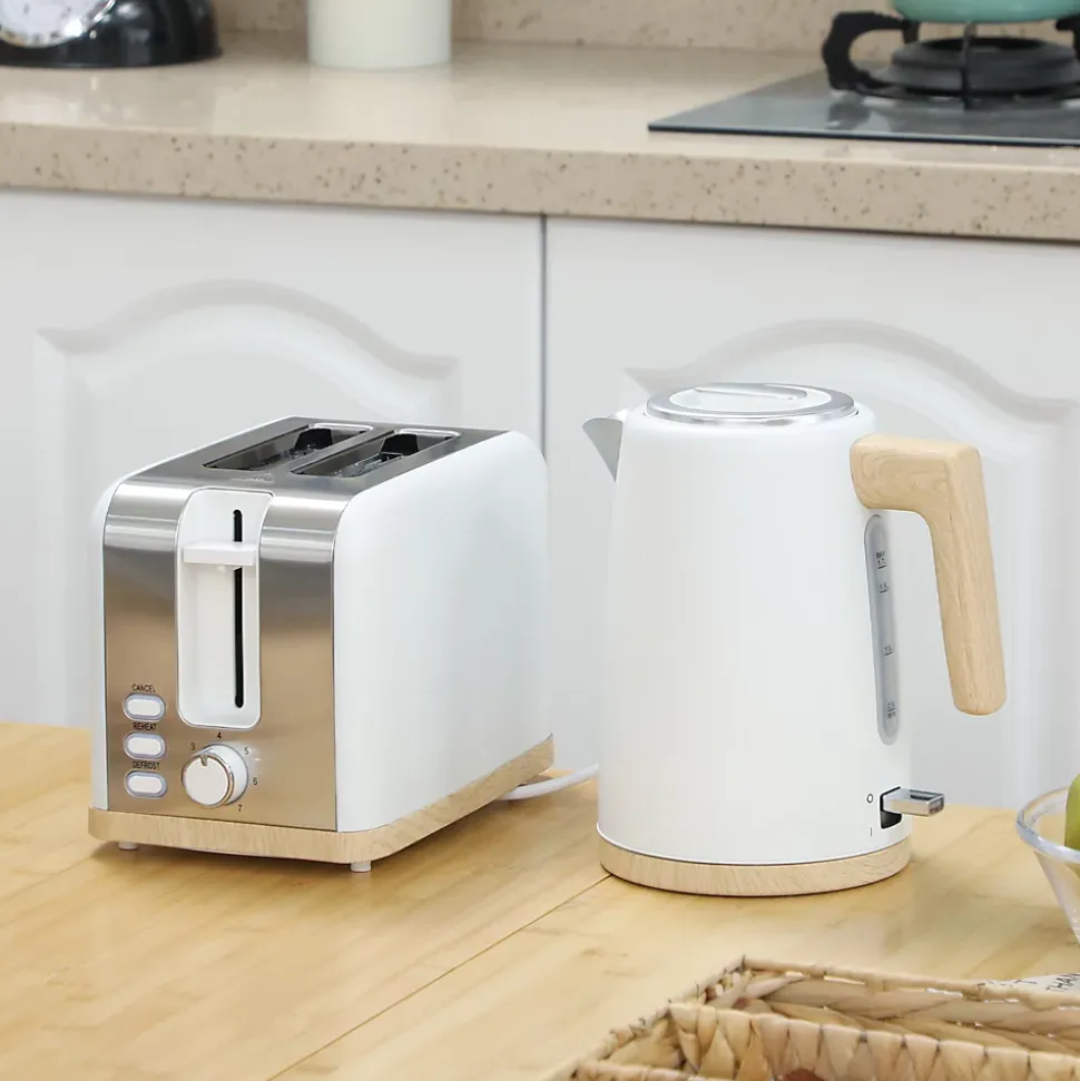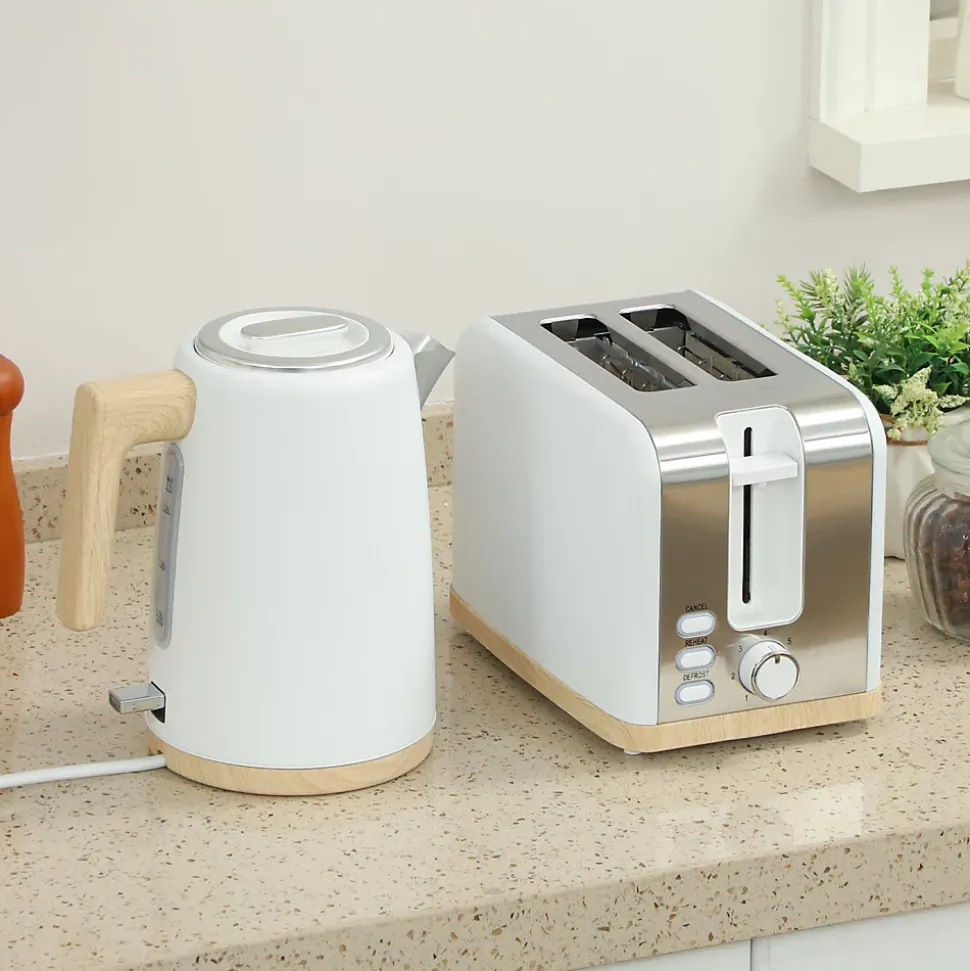 Apportez une touche d’élégance à votre cuisine avec l’ensemble bouilloire et grille-pain blanc HOMCOM. Leur finition mate et l’effet bois moderne subliment votre espace. Le grille-pain offre 7 niveaux de dorage, réchauffage et dégivrage, avec des bagues lumineuses.Caractéristiques :- Bouilloire inox de 1,7L pour servir facilement 6-8 tasses- Grille pain blanc avec fonctions réchauffage, décongélation et annulation pour plus de polyvalence- Design à levée haute pour retirer facilement les petites tranches- 7 niveaux de brunissage pour un toast parfait à chaque fois- Arrêt automatique sur les deux appareils, fabriqués sans BPA pour votre sécurité. Protection contre l’ébullition à sec pour la bouilloire- Rangement intégré du cordon pour un plan de travail toujours propre- Filtre amovible de la bouilloire électrique inox pour un nettoyage rapide et facileSpécifications :- Couleur : blanc, ton argent, effet bois- Matériau : PP, acier inoxydable- Dimensions de la bouilloire : 22,4L x 15,6l x 23,9H cm (avec base)- Capacité de la bouilloire : 1,7 L (max.), 500 ml (min.)- Dimensions du grille-pain : 26,4L x 17,3l x 18,9H cm- Dimensions de chaque fente : 13,5L x 3,5l x 13,5H cm- Tension : 220-240V, 50/60Hz- Puissance : 1850-2200W (bouilloire), 780-930W (grille-pain)- Longueur du câble : 0,7m (bouilloire, grille-pain)- Réf. : 800-234V90WT