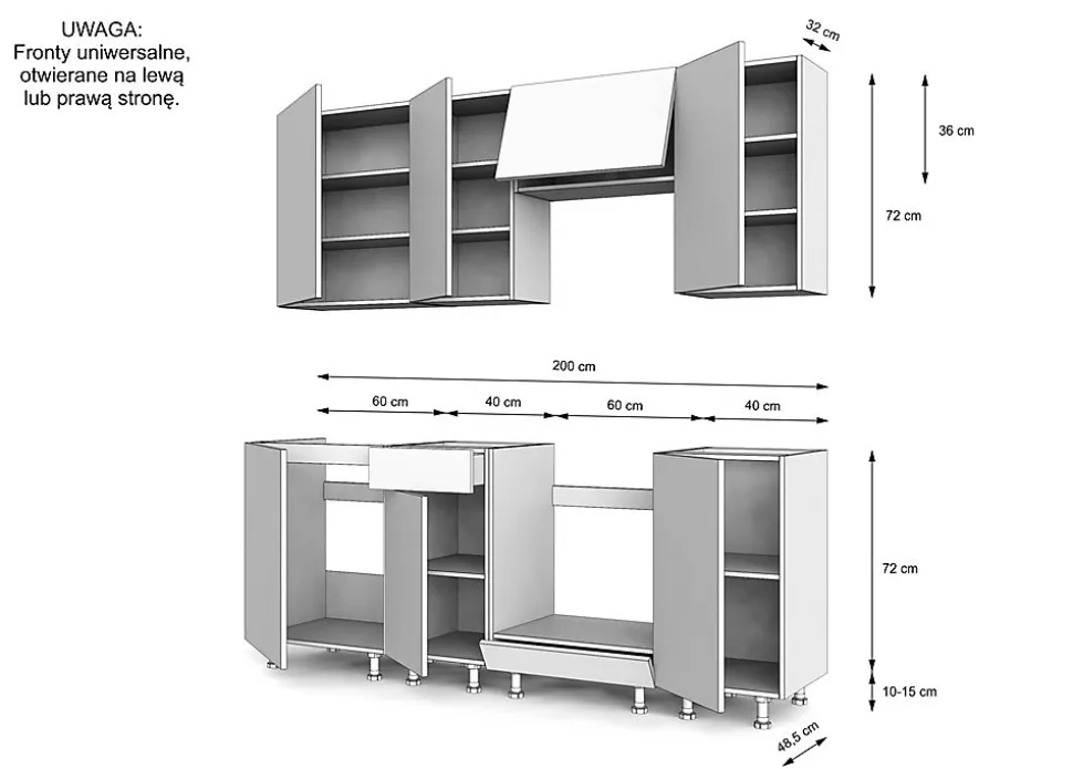 La solution idéale pour une petite cuisine ou une kitchenette dans un appartement à l’espace limité est un ensemble de cuisine composé de meubles pour appareils électroménagers encastrables.L’ensemble de cuisine est fabriqué en panneaux stratifiés. Il est livré à l’adresse indiquée par le client avec une notice de montage claire et lisible et un jeu complet d’accessoires certifiés nécessaires à l’installation.Cette offre s’applique uniquement aux meubles avec meubles. Les appareils électroménagers sont présentés à titre indicatif uniquement.La palette contient les accessoires nécessaires au montage et les instructions pour un assemblage à faire soi-même. Le meuble comporte deux tiroirs et sept portes.Le produit est livré sur palette par coursier ou transitaire. Pour des raisons de sécurité, veuillez fixer solidement le meuble au mur si possible.Couleur : Noir/Noir/Chêne Évoqué, Finition façade : Panneau stratifié, épaisseur façade : 16 mm, Matériau corps : Panneau stratifié, épaisseur corps : 16 mm, Poignées : Plastique noir.Dimensions du meuble : Largeur : 200 cm, Hauteur : RÉGLABLE cm, Profondeur : 48,5 cm.L’ensemble se compose de huit éléments et d’un plan de travail. Meubles bas : profondeur du plan de travail : 48,5 cm. Meubles hauts : profondeur : 32 cm. Épaisseur du plan de travail : 3,8 cm. Meubles bas : hauteur : 72 cm, pieds : 10 cm, recouverts d’un socle esthétique.Cette offre s’applique uniquement à l’ensemble de meubles en aggloméré, hors électroménager et accessoires.
