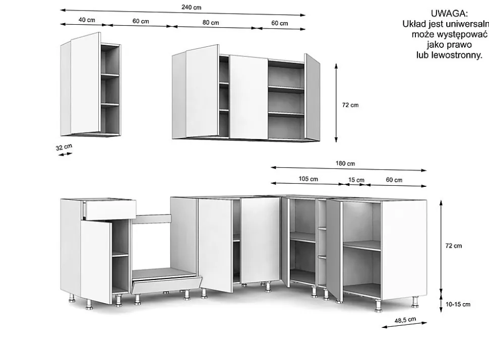 La solution idéale pour une petite cuisine ou une kitchenette dans un appartement à l’espace limité est un ensemble de cuisine composé de meubles pour appareils électroménagers encastrables.L’ensemble de cuisine est fabriqué en panneaux stratifiés. Il est livré à l’adresse indiquée par le client avec une notice de montage claire et lisible et un jeu complet d’accessoires certifiés nécessaires à l’installation.Cette offre s’applique uniquement aux meubles avec meubles. Les appareils électroménagers sont présentés à titre indicatif uniquement. La palette contient les accessoires nécessaires au montage et les instructions pour un assemblage à faire soi-même.Le meuble comporte deux tiroirs, neuf portes et trois étagères. La livraison s’effectue par coursier ou transporteur sur palette. Pour des raisons de sécurité, veuillez fixer solidement le meuble au mur si possible.Couleur : Noir/Chêne Évoqué, Finition façade : Panneau stratifié, Épaisseur façade : 16 mm, Matériau corps : Panneau stratifié, Épaisseur corps : 16 mm, Poignées : Plastique noir.Dimensions du meuble : Largeur : 240/180 cm, Hauteur : RÉGLABLE cm, Profondeur : 48,5 cm. L’ensemble se compose de neuf éléments et d’un plan de travail.Meubles bas : profondeur du plan de travail : 48,5 cm. Meubles hauts : profondeur : 32 cm. Épaisseur du plan de travail : 3,8 cm. Meubles bas : hauteur : 72 cm, pieds : 10 cm, recouverts d’un socle esthétique.Cette offre s’applique uniquement à l’ensemble en aggloméré, hors électroménagers et accessoires.