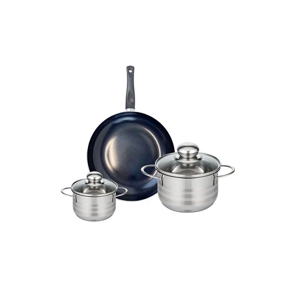 - DESCRIPTION: Cet ensemble comprend une poêle de cuisson de 24 cm en aluminium avec un revêtement en céramique anti-adhésif et deux faitouts de 12 et 16 cm en inox sans revêtement offrant robustesse et compatibilité avec les plaques à induction