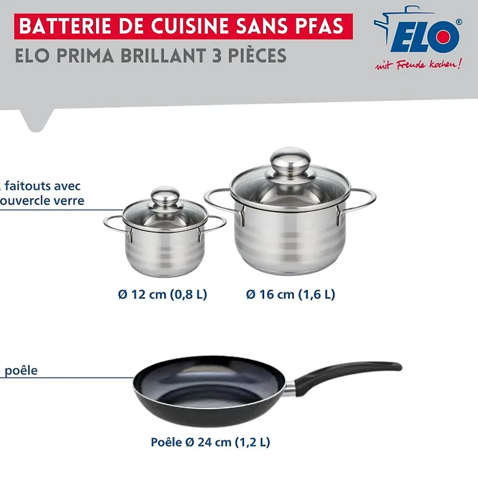 Découvrez l’ensemble de cuisine Elo Prima Brillant, composé d’une poêle de cuisson de 24 cm et de deux faitouts de 12 et 16 cm. Parfait pour les passionnés de cuisine, cet ensemble répond à tous vos besoins culinaires, que ce soit pour saisir, mijoter ou cuire à la vapeur.La poêle en aluminium de 24 cm est dotée d’un revêtement en céramique ultra résistant et anti-adhésif, garantissant une cuisson saine sans ajout de matières grasses. Sa légèreté et sa répartition uniforme de la chaleur vous permettent de préparer des plats savoureux en un rien de temps.Les faitouts en inox, d’une capacité de 12 et 16 cm, sont idéaux pour la cuisson de soupes, de plats mijotés ou de légumes à la vapeur. Leur conception robuste assure une excellente rétention de la chaleur et une durabilité à toute épreuve. L’inox, sans revêtement, garantit une cuisson saine et sans risques de substances indésirables.Compatible avec toutes les sources de chaleur, y compris l’induction, cet ensemble est également facile à entretenir. Profitez de la qualité et de l’esthétique du design brillant de cette batterie de cuisine, qui s’intègre parfaitement dans toutes les cuisines modernes. Que vous soyez un cuisinier amateur ou un chef aguerri, cet ensemble vous accompagnera dans toutes vos créations culinaires.