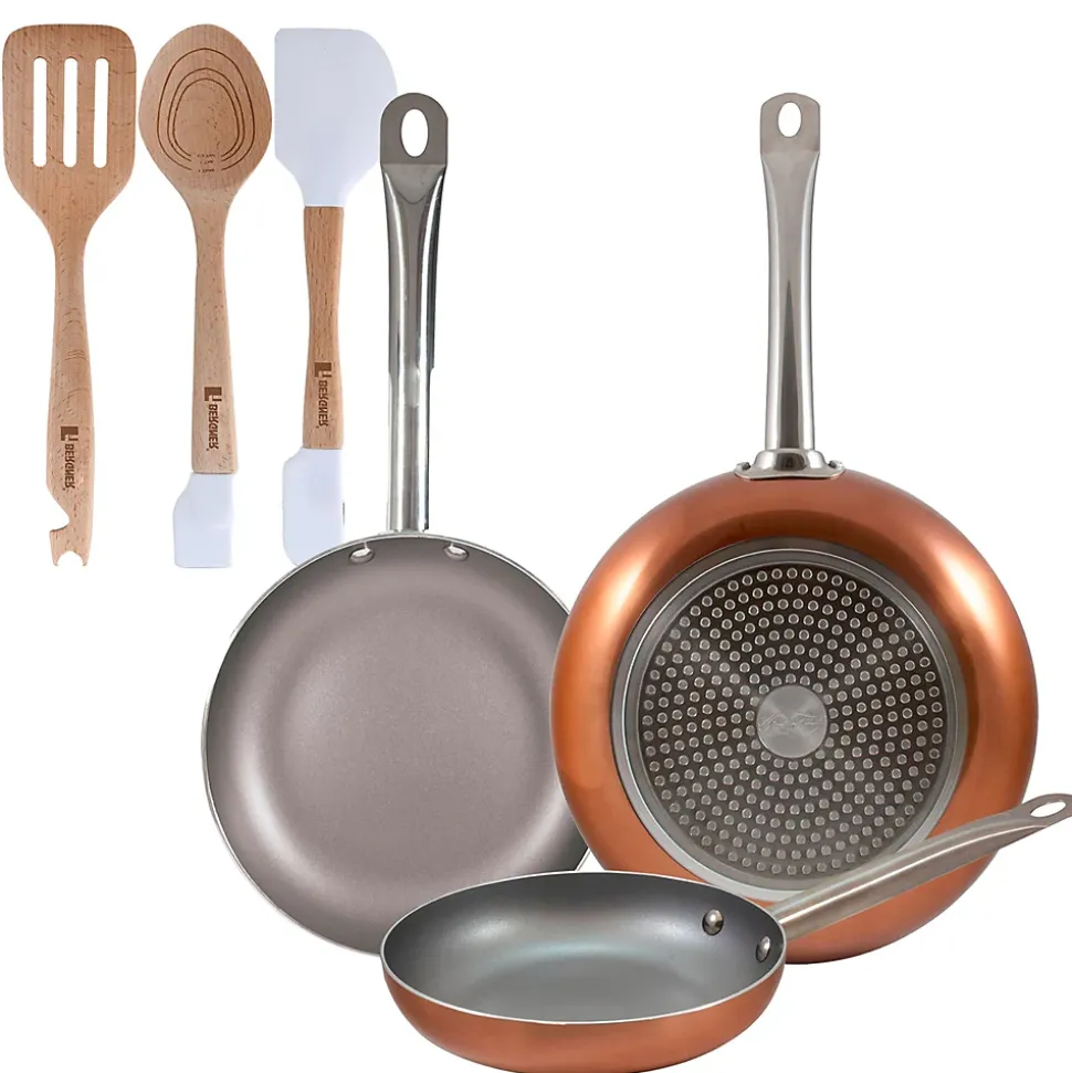 Ensemble de 3 poêles San Ignacio de la collection Optimum Plus, en aluminium pressé.Poêle Ø18 x 4 cmPoêle Ø22 x 4,3 cmPoêle Ø26 x 5,4 cmPoignées tubulaires creuses professionnelles.Revêtement antiadhésif Whitford Quantanium gris marbré.Extérieur couleur cuivre.Compatible avec tous types de feux, y compris l’induction.Sans PFOEA Ensemble spatule, louche et cuillère à égoutter en silicone et bois de hêtre.