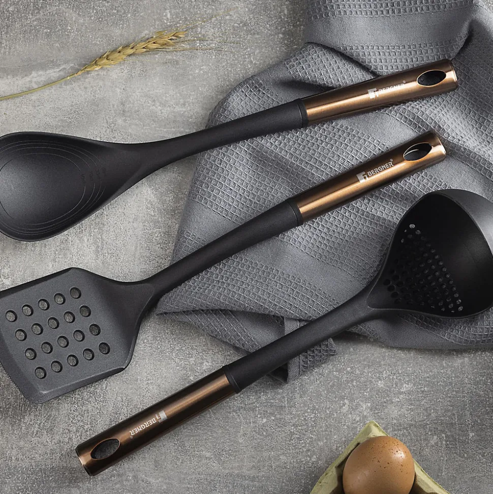 Ensemble de 3 poêles à frire San Ignacio Collection Jolie en aluminium forgé.Poêle à frire Ø 18 cmPoêle à frire Ø 22 cmPoêle à frire Ø 26 cmPoignées ergonomiques de couleurs différentes.Revêtement antiadhésif marbré.Compatible avec tous les types de feux, y compris l’induction.Ensemble de 3 ustensiles de cuisine comprenant une spatule ajourée (35,7 x 8,5 x 4,8 cm), une cuillère (36 x 8 x 4 cm) et une louche (34 x 9 x 9 cm).Fabriqué en PBT noir résistant.