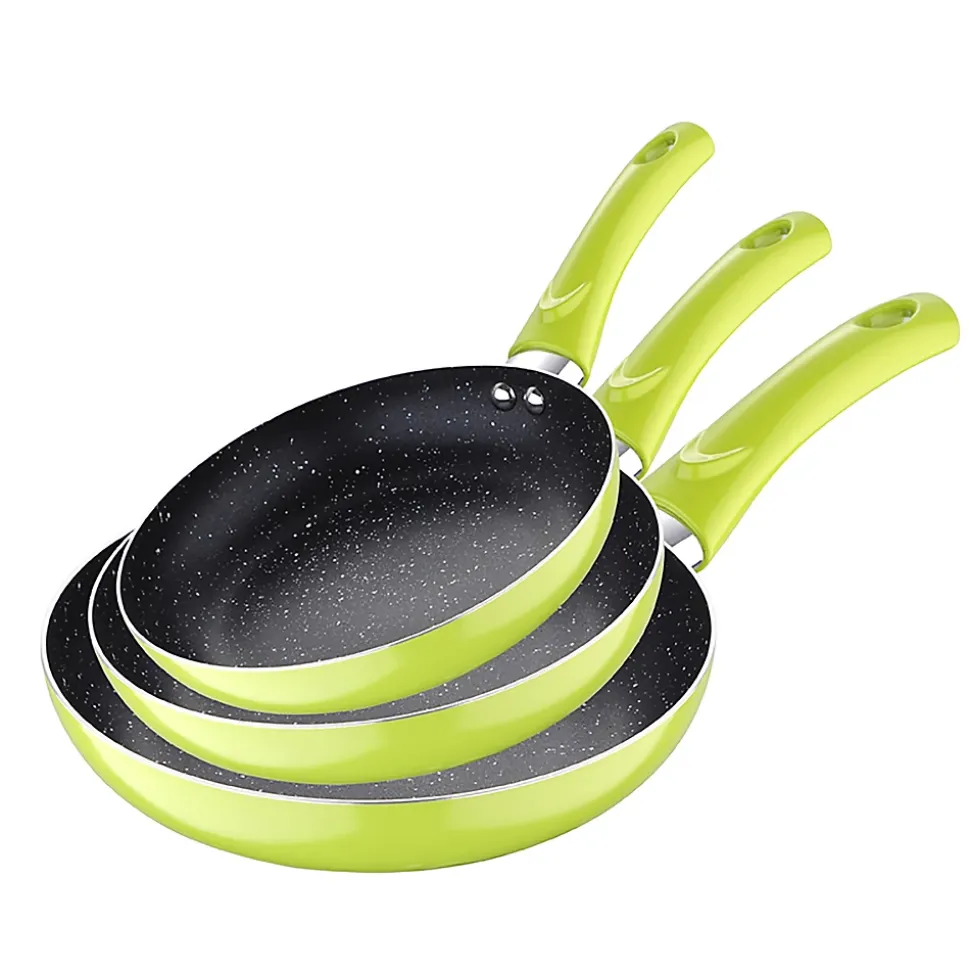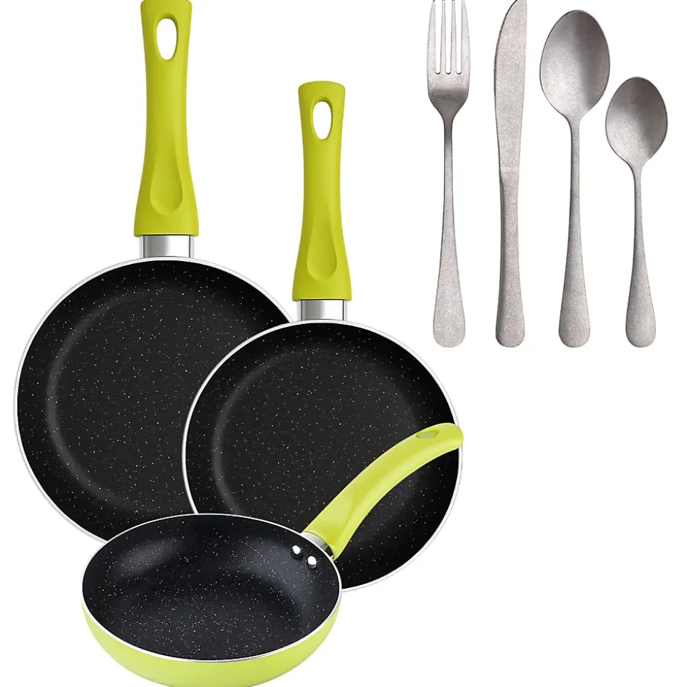 Ensemble de 3 poêles à frire San Ignacio Collection Molen en aluminium pressé.Poêle Ø20 x 4 cmPoêle Ø20 x 4,5 cmPoêle Ø28 x 5,5 cmSans PFOA.Revêtement antiadhésif.Compatible avec les plaques de cuisson à gaz, électriques, vitrocéramiques et halogènes.Couleur verte.>Ensemble de 16 couverts en acier inoxydable pour 4 personnes. Finition polie pierre.
