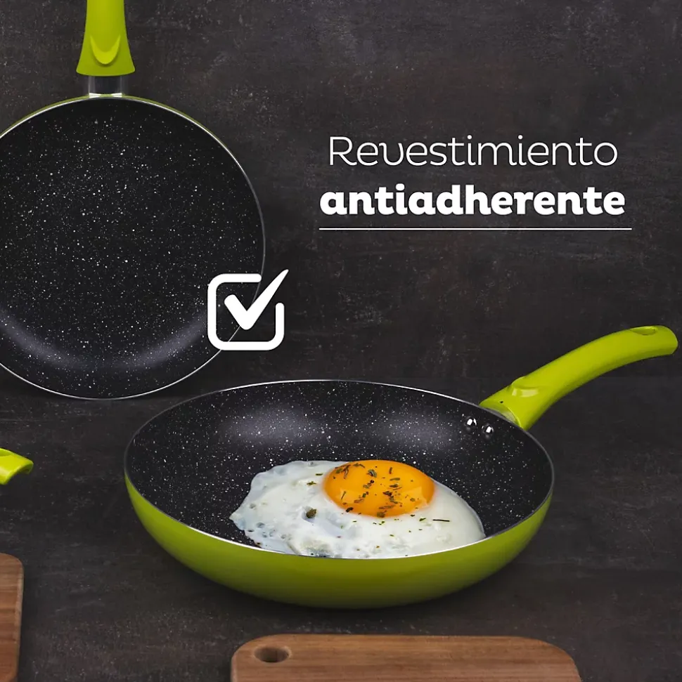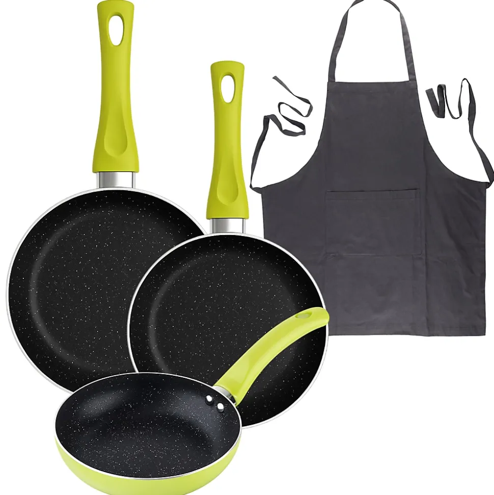 Ensemble de 3 poêles à frire San Ignacio Molen Collection en aluminium pressé.Poêle Ø 20 x 4 cmPoêle Ø 20 x 4,5 cmPoêle Ø 28 x 5,5 cmSans PFOA.Revêtement antiadhésif.Compatible avec les plaques de cuisson à gaz, électriques, vitrocéramiques et halogènes.Vert. Tablier en coton gris foncé 75 x 80 cm.