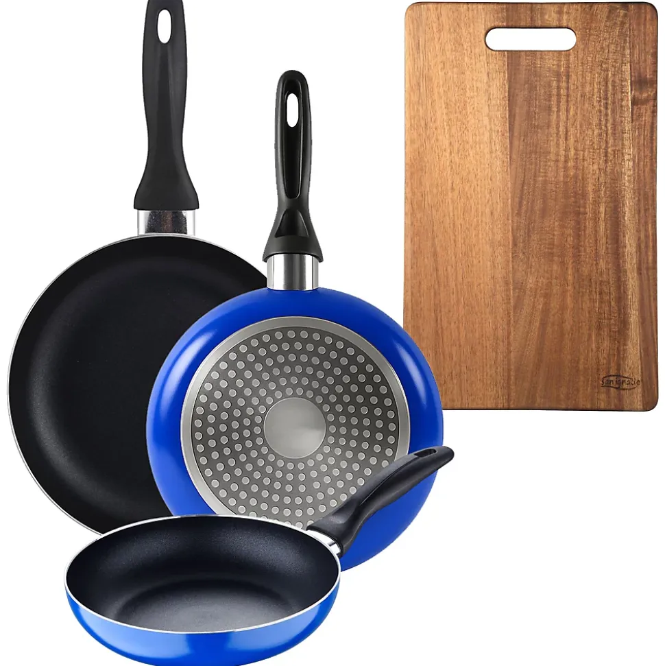 Ensemble de 3 poêles San Ignacio Navy Paradise en aluminium pressé.Poêle Ø16 x 3,5 cmPoêle Ø20 x 4,5 cmPoêle Ø24 x 4,5 cmPoignées ergonomiques en thermoplastique.Revêtement antiadhésif et fond diffuseur intégré.Compatible avec tous types de feux, y compris l’induction.Couleur bleue. Planche à découper en bois d’acacia 40 x 25 x 1,6 cm.