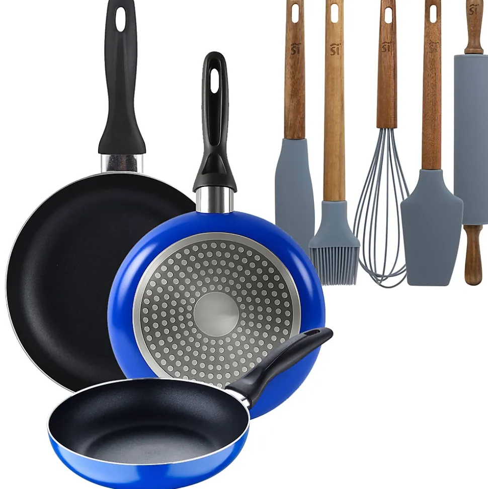 Ensemble de 3 poêles San Ignacio Navy Paradise en aluminium pressé.Poêle Ø16 x 3,5 cmPoêle Ø20 x 4,5 cmPoêle Ø24 x 4,5 cmPoêle en thermoplastique avec poignées ergonomiques.Revêtement antiadhésif et fond diffuseur encapsulé.Compatible avec tous types de plaques de cuisson, y compris l’induction.Couleur bleue. Ensemble de pâtisserie comprenant une pince, un fouet, un pinceau, une spatule, un racloir et un rouleau à pâtisserie.Fabriqué en silicone et en bois d’acacia.