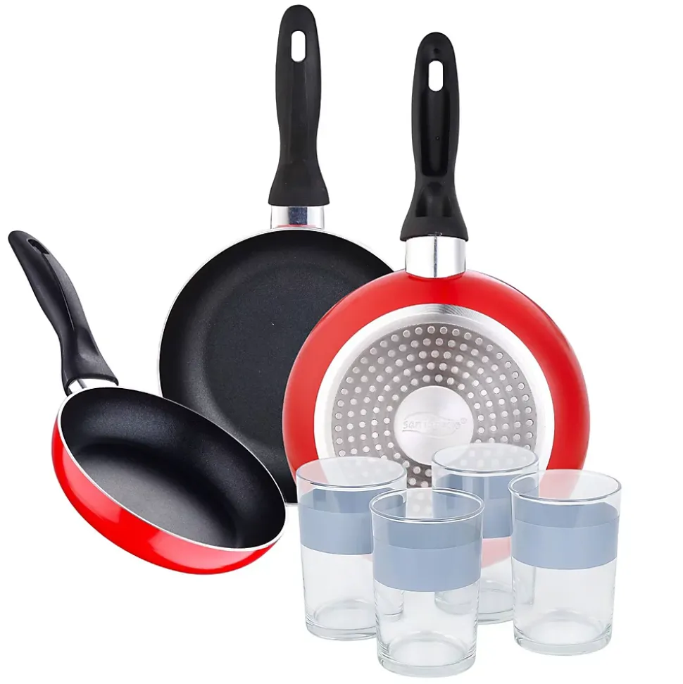 Lot de 3 poêles à frire San Ignacio Navy Rouge en aluminium pressé.Poêle Ø16 x 3,5 cmPoêle Ø20 x 4,5 cmPoêle Ø24 x 4,5 cmPoignées isolantes.Revêtement antiadhésif.Compatible avec tous les feux, y compris l’induction.Couleur rouge.Lot de 4 verres bleus de 50 cl.