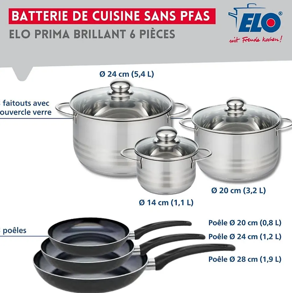 Découvrez l’ensemble de 3 poêles de cuisson et de 3 faitouts Elo Prima Brillant, une batterie de cuisine idéale pour tous vos besoins culinaires. Composée de poêles de 20, 24 et 28 cm, cet ensemble répond à toutes vos envies de cuisson, que ce soit pour faire sauter, frémir ou saisir. Fabriquées en aluminium avec un revêtement en céramique sans PFAS, ces poêles offrent une excellente conductivité thermique et un anti-adhésif ultra résistant, garantissant une cuisson sans accrocs et un nettoyage facile.Les 3 faitouts de 14, 20 et 24 cm, quant à eux, sont conçus en inox de haute qualité, assurant une robustesse et une longévité exceptionnelles. Sans revêtement, ils sont parfaits pour mijoter des plats savoureux, cuire des soupes ou préparer des sauces. Leur design élégant s’intègre parfaitement dans toutes les cuisines modernes.Tous les produits de cet ensemble sont compatibles avec tous les types de feux, y compris l’induction, et offrent une excellente répartition de la chaleur pour des résultats de cuisson optimaux. Profitez de la polyvalence, de la performance et de l’esthétique de cette batterie de cuisine pour enrichir votre expérience culinaire. Que vous soyez un chef amateur ou un cuisinier aguerri, cet ensemble répondra à vos attentes les plus exigeantes.