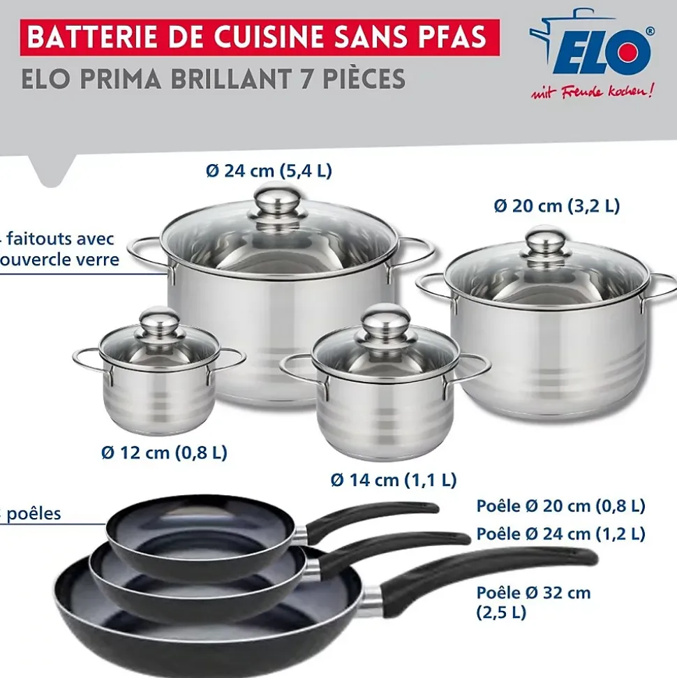 Découvrez l’ensemble de 3 poêles de cuisson et 4 faitouts Elo Prima Brillant, une batterie de cuisine idéale pour tous vos besoins culinaires. Composée de poêles de 20, 24 et 32 cm, cet ensemble vous permet de préparer une variété de plats, des sautés aux sauces, en passant par les omelettes et les crêpes. Fabriquées en aluminium avec un revêtement en céramique sans PFAS, ces poêles offrent une surface de cuisson ultra résistante et anti-adhésive, garantissant une cuisson uniforme et un nettoyage facile.Les faitouts de 12, 14, 20 et 24 cm, quant à eux, sont conçus en inox de haute qualité, assurant robustesse et longévité. Parfaits pour mijoter des soupes, cuire des viandes ou préparer des plats en sauce, ces faitouts sont compatibles avec tous les types de feux, y compris l’induction. Leur design élégant et brillant est non seulement esthétique, mais également fonctionnel, avec des poignées ergonomiques pour une manipulation aisée.Optez pour cet ensemble qui allie performance et style, et transformez votre expérience culinaire. Que vous soyez un chef expérimenté ou un cuisinier amateur, l’ensemble Elo Prima Brillant répondra à toutes vos attentes en cuisine.