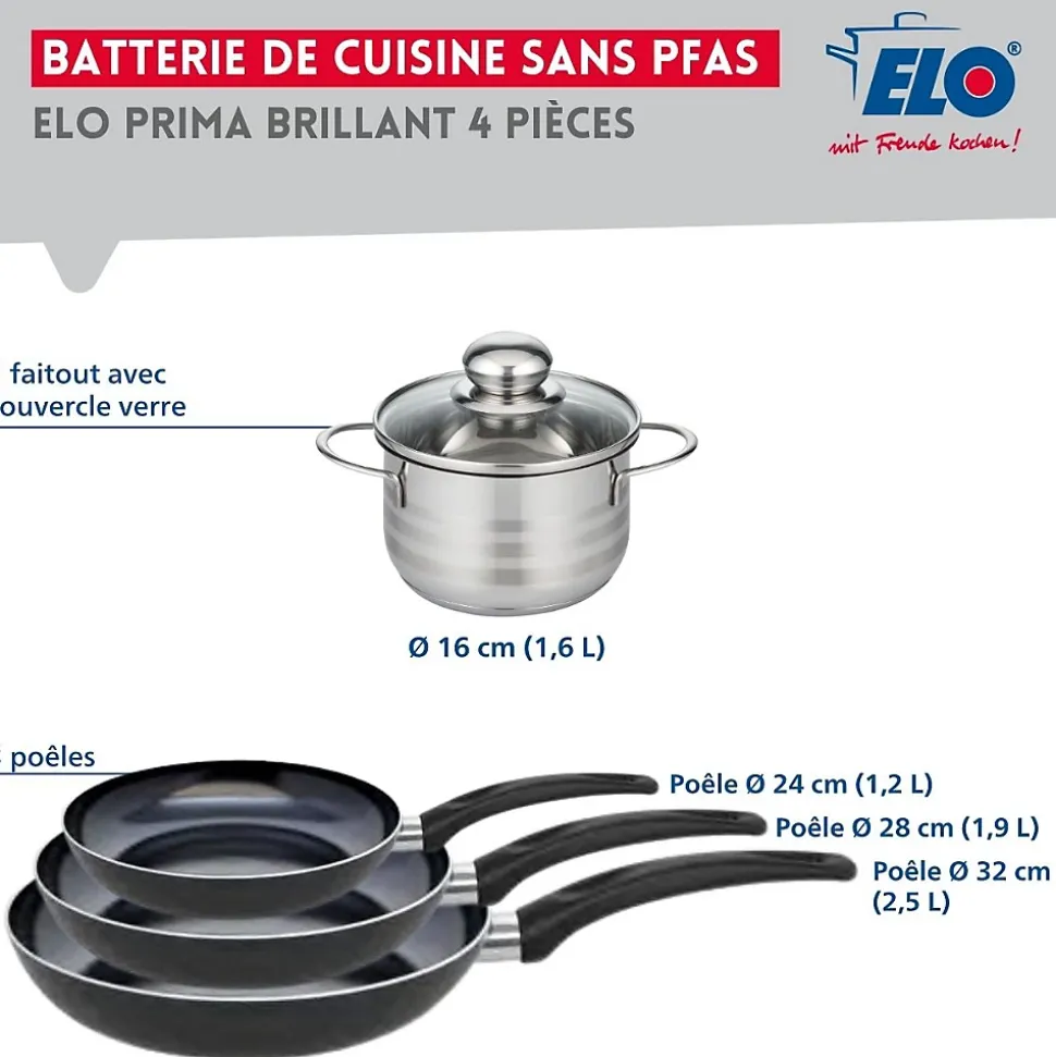 Découvrez l’ensemble de 3 poêles de cuisson et 1 faitout Elo Prima Brillant, une batterie de cuisine conçue pour répondre à tous vos besoins culinaires. Composée de poêles de 24, 28 et 32 cm, ainsi que d’un faitout de 16 cm, cet ensemble est idéal pour la préparation de plats variés, des sautés rapides aux mijotés savoureux.Les poêles sont fabriquées en aluminium léger, offrant une excellente conductivité thermique pour une cuisson rapide et homogène. Leur revêtement en céramique sans PFAS garantit une surface anti-adhésive ultra résistant, facilitant le nettoyage et réduisant l’utilisation de matières grasses lors de la cuisson. Vous pouvez ainsi cuisiner de manière saine tout en préservant les saveurs de vos ingrédients.Le faitout en inox, sans revêtement, assure une robustesse et une longévité exceptionnelles. Parfait pour les soupes, les sauces ou les plats mijotés, il est compatible avec tous les types de feux, y compris l’induction. Sa conception ergonomique permet une manipulation aisée.Cet ensemble est non seulement fonctionnel, mais aussi élégant avec sa finition brillante qui apportera une touche moderne à votre cuisine. Que vous soyez un chef expérimenté ou un cuisinier amateur, cet ensemble de cuisson répondra à vos attentes en alliant performance et esthétique. Transformez vos moments en cuisine en une expérience agréable et réussie avec l’Elo Prima Brillant.