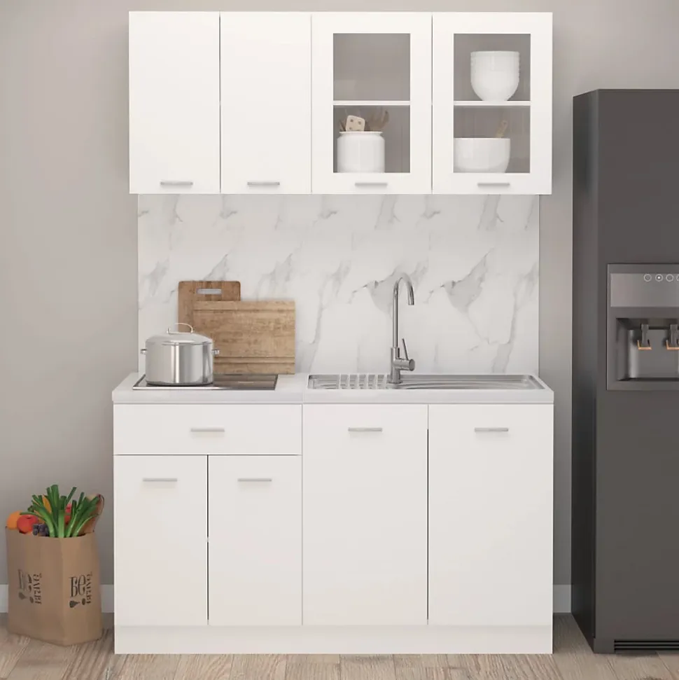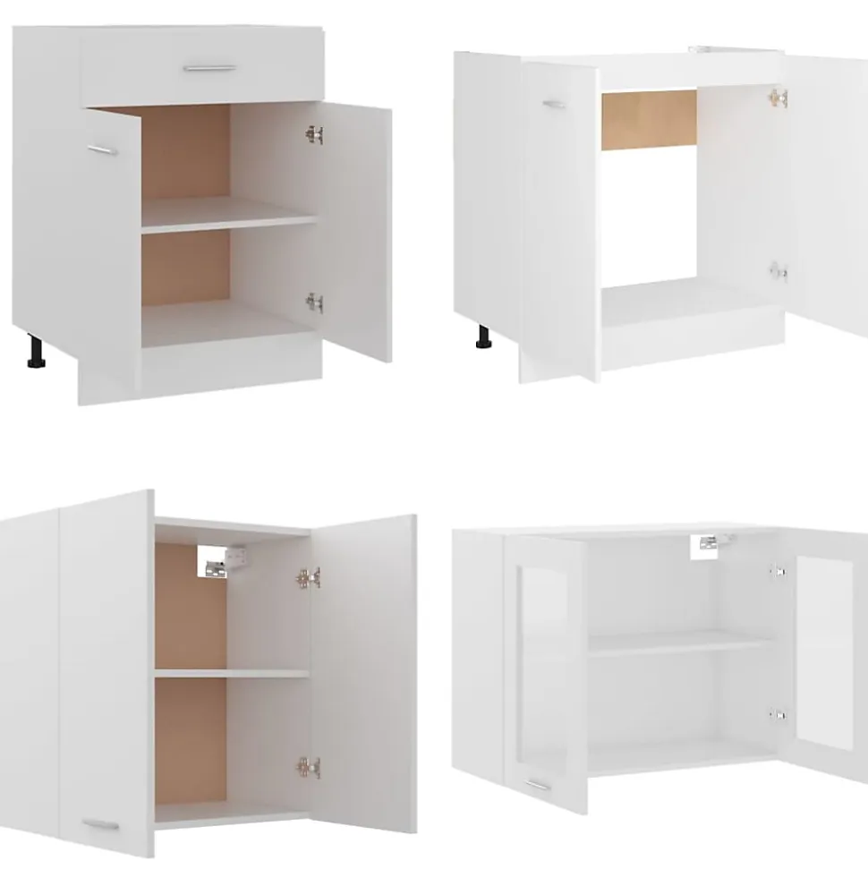 Cet ensemble de meubles de cuisine 4 pcs Blanc Bois d’ingénierie de la marque VIDAXL optimise votre espace culinaire avec un design élégant. Fabriqué en bois d’ingénierie et verre, durable et fonctionnel, il offre un espace de rangement suffisant. Assemblage requis, livré avec fixation murale pour la sécurité.