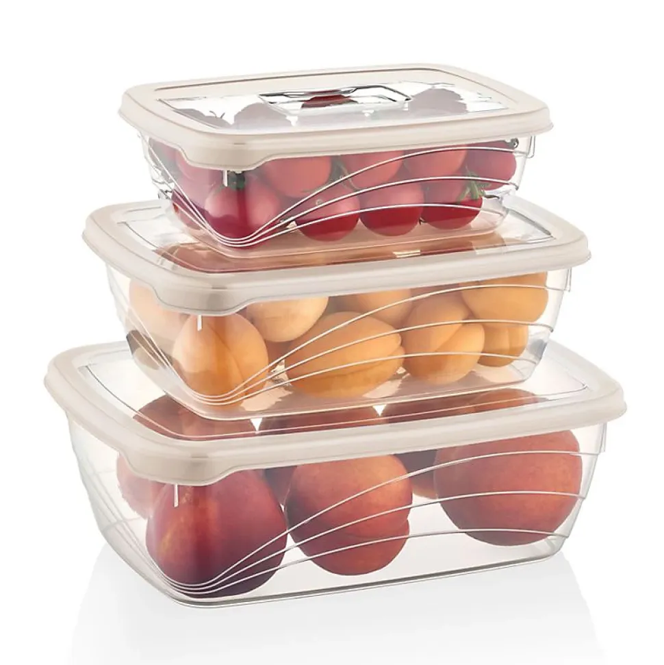Solution de stockage tout-en-unConteneurs de stockage qui s’emboîtent commodément ensembleLe système de verrouillage unique est testé en termes de durabilité pour des performances durablesLe système de verrouillage amélioré est hermétique pour garder les aliments frais plus longtempsSans BPA pour une conservation saine des alimentsCouvercles en silicone aux couleurs vivesLes contenants vont au congélateur et au lave-vaisselle3 tailles de conteneurs et couvercles de couleur assortieLe joint en silicone amélioré est 100 % étanche à l’airGarde les aliments frais plus longtempsIl est étanche pour éviter les gouttes et les déversements indésirables.1900 ml (25 x 17,8 x 8,2 cm)3200 ml (28,6 x 20,5 x 9,7 cm)1200 ml (20 x 14,5 x 6,5 cm)