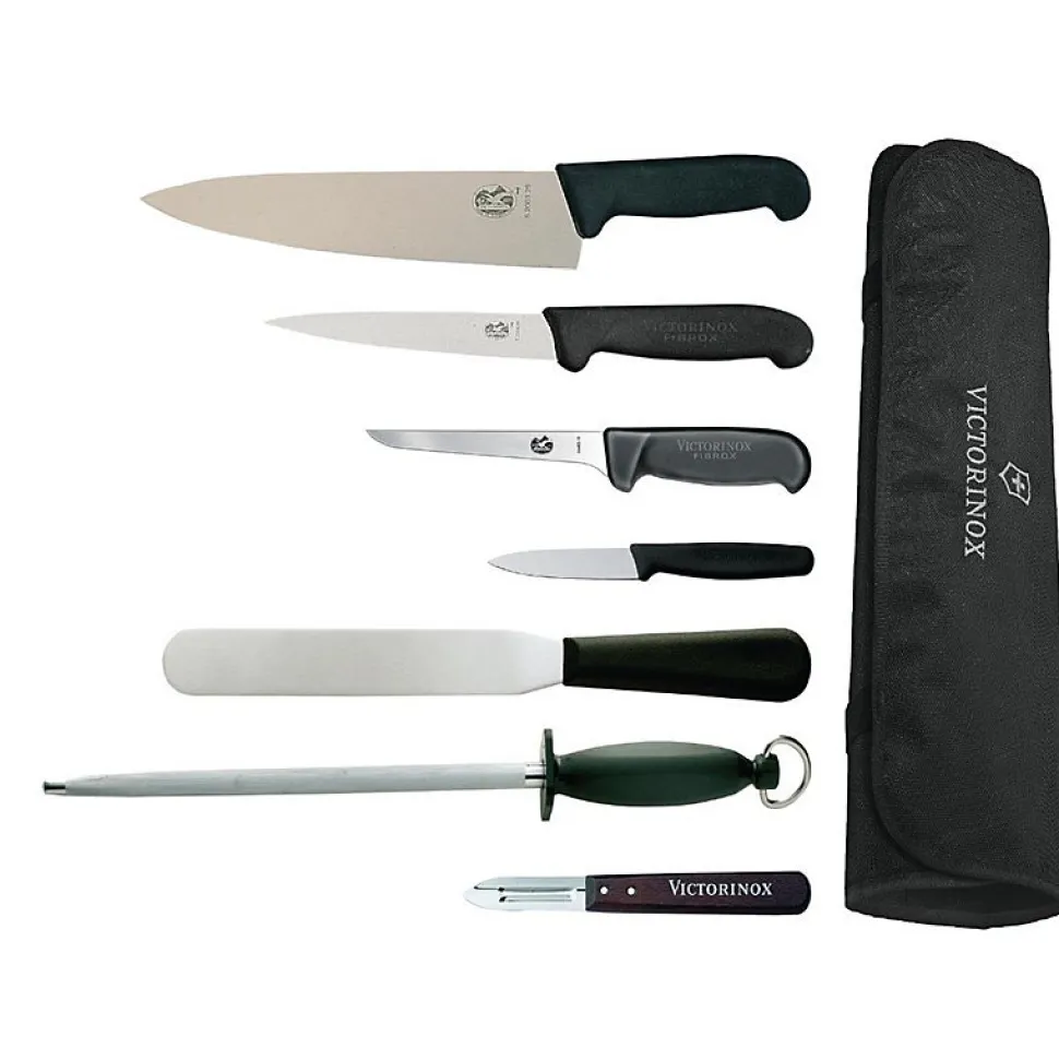 Ensemble de plusieurs couteaux en inox Les couteaux Hygiplas sont fabriqués avec des lames durables en acier inoxydable et des manches en nylon résistants aux chocs. Le fusil à grains moyens Vogue dispose d’une couche supplémentaire de chrome dur, offrant une résistance plus grande à l’usure. La poignée en plastique moulé est légère et confortable, et permet un contrôle total lors du changement de l’angle d’affûtage.Age min pour Achat du produit: +18 ansMatériel: Acier inoxydable à haute teneur en carbonePoids: 1,26 kgCouteau Chef 21,5 cm – VictorinoxCouteau filet de sole 15 cm – VictorinoxCouteau à désosser 12,5 cm – VictorinoxCouteau d’office 7,5 cm – HygiplasSpatule 20,5 cm – HygiplasFusil 25,5 cm – VogueEconome – VictorinoxEtui à couteaux en nylon – VictorinoxL’ensemble de couteaux 7 pièces est constitué de produits Victorinox, Vogue et Hygiplas